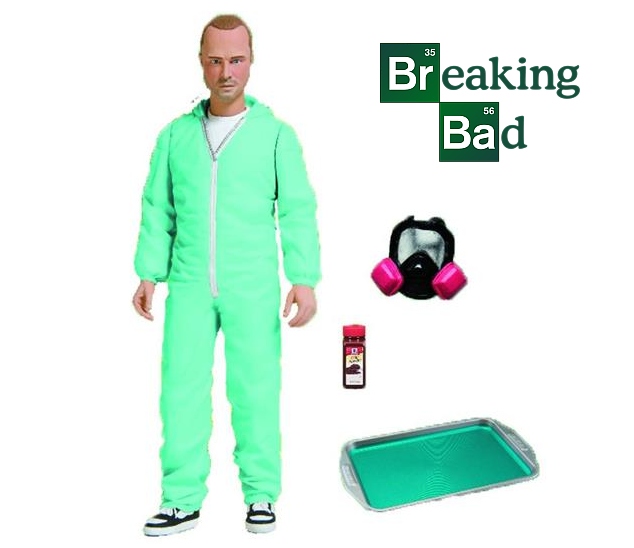 With multiple variants of Breaking Bad's Walter White now in the hands of collectors, Mezco Toyz prepares to unleash the other half of the meth-making duo: JESSE PINKMAN. As revealed at Toy Fair, the standard 6" figure release will have Jesse sporting a yellow hazmat suit. BigBadToyStore.com has now opened pre-orders on the first variant of Jesse, Aaron Paul's character wearing a blue hazmat suit. This Diamond PX Previews Exclusive will be available at comic book and specialty stores this August priced at $18.99. The figure will also include a gas mask, chili powder, and a tray of blue crystal.