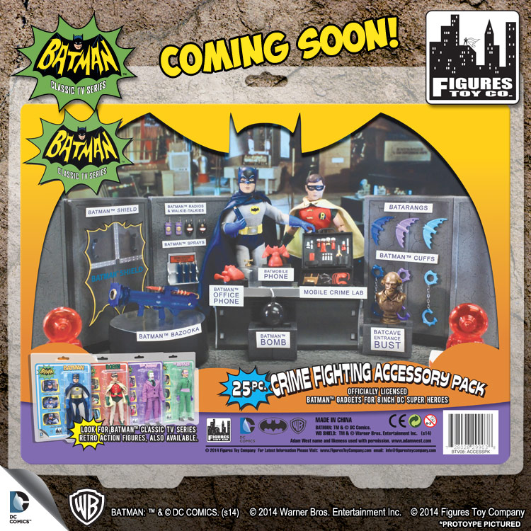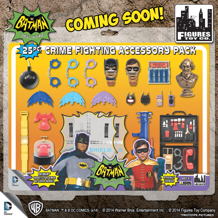 Figures Toy Co. announces a 25-Piece Accessory Pack fro use with their 8-inch retro Batman Classic TV Series. The set includes all sorts of fun gadgets and gear, perfect for recreating your own Batcave. Pricing and pre-order information to be available soon.