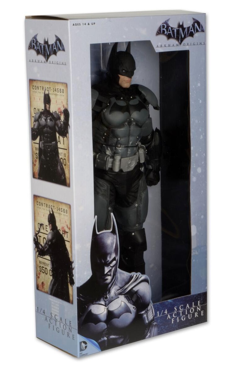 NECA has released a new packaged photo of their Quarter Scale Arkham Origins Batman. The figure stands 18″ tall and features over 25 points of articulation, a real fabric cape, and accessories which include Batarang and grapnel gun. This figure is scheduled to start arriving next week.