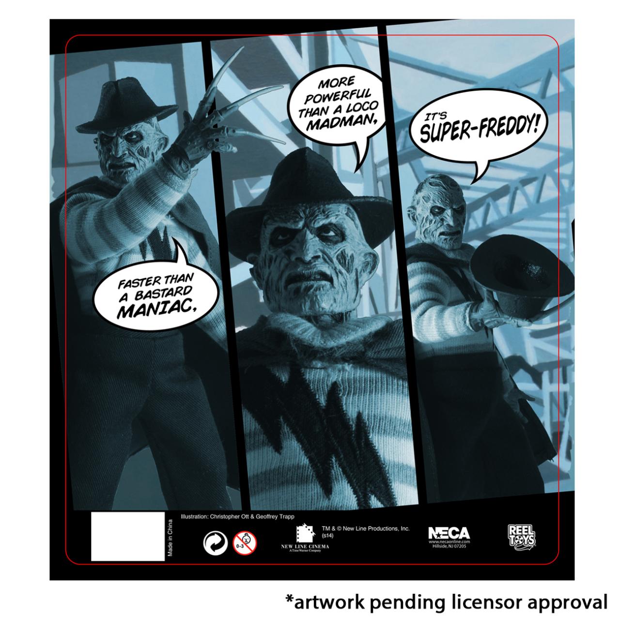 NECA kicks off their San Diego Comic Con 2014 exclusive reveals with a look at SUPER FREDDY. This 8-inch retro style action figure is based on Freddy Krueger's appearance in A Nightmare on Elm Street Part 5: The Dream Child. It is the first time this look has produced in figure form. Super Freddy will be sold July 24-27 at the event, the figure limited to only 5000 pieces and priced at $40. It comes in a blister card with backer card custom illustrated by Christopher Ott and Geoffrey Trapp.