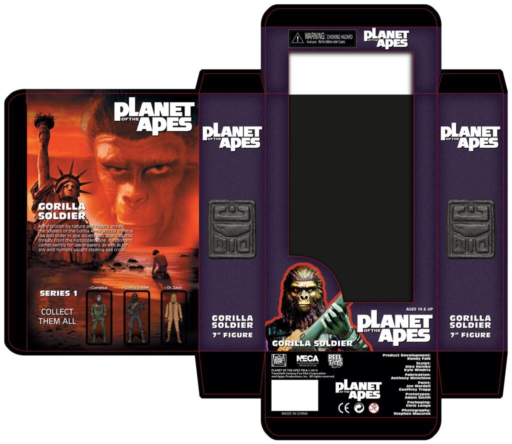 NECA is breaking tradition with their new series of 7" Classic Planet of the Apes action figures, putting their typical clamshell blister aside in favor of a closed window box. Pictured above is look at the new packaging design. The first assortment is scheduled for release this July and will feature Dr. Zaius, Gorilla Soldier and Cornelius.