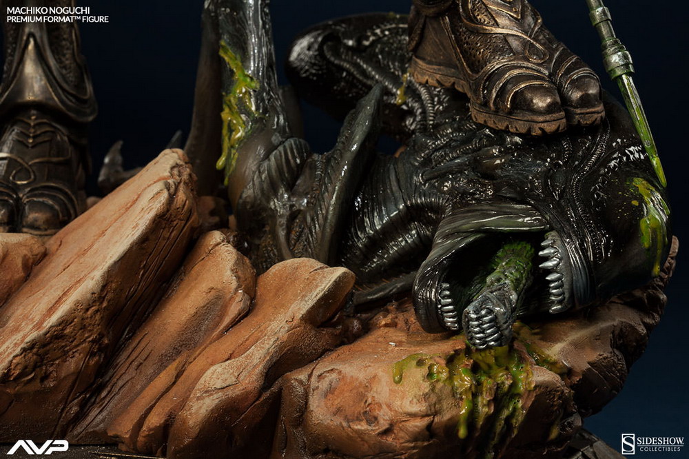 Standing triumphantly over a slain Alien, and armed with razor sharp wrist gauntlets, a combi-stick spear and shoulder-mounted plasma cannon, Machiko will be offered as both a standard release as well as a Sideshow Exclusive with additional ceremonial Predator knife swap-out weapon accessory.
