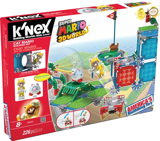 Mouse enemy with the Cat Mario Building Set from K’NEX! Build Cat Mario and use the exclusive jump panels to attempt to dodge the Mouse enemy. Set also features rotating coins, a clear warp pipe and a pop-up flag. Suggested retail price is $34.99 each. Ages 8+. Available Fall 2014.