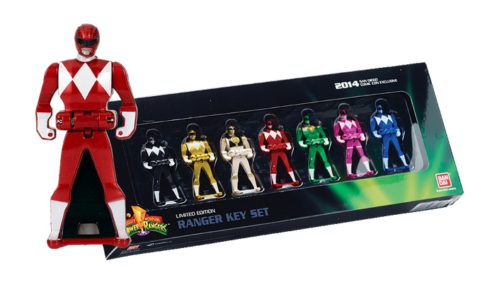 Unlock the power with the Limited Edition Mighty Morphin POWER RANGERS Legendary Ranger Key Set! Together in this complete set are all seven Mighty Morphin Power Rangers, including exclusive Pink Ranger and Yellow Ranger which are unavailable outside of this collection! All seven keys activate features by inserting them into the Deluxe Legendary Morpher (sold separately), and the Mighty Morphin Red Ranger Key unlocks an exclusive convention sound! The Ranger Keys included in the complete set unlock sounds and features throughout the Power Rangers Super Megaforce toy line, and can be scanned for digital play with the Power Rangers Scanner App available for Apple and Android. With 3 exclusive keys included, this complete set is a necessity for Power Rangers fans young and old! Only 700 produced. Available exclusively at the Bandai America booth #121 at San Diego Comic-Con. Limited quantities available each day.