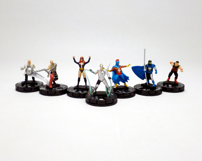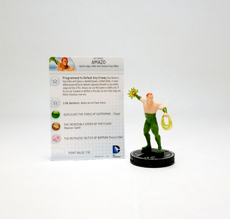 While he’s the newest and biggest, this new convention version is actually the cheapest of the three Amazos in HeroClix. The others were high powered monsters with tons of powers and long range, but nothing that really captured the android’s power stealing abilities in action. This one changes all that with a very affordable 130 point figure that has Flight, Indomitable, and a 7 range (the first of several “7”s for Amazo). His dial is the epitome of consistency with a full 7 clicks of the same 9/10/17/3 stats! Seven standard powers appear on his dial in seven different combinations: Charge, Hypersonic Speed, Precision Strike, Energy Explosion, Energy Shield/Deflection, Invulnerability, and Outwit. Then there are two traits which really make things interesting. One gives the robot permanent Super Senses, which is especially helpful on the clicks with no defensive powers. The big one, “Programmed to Defeat Any Enemy,” requires a free action to choose a standard power, combat ability, or team ability on an opponent in range/LoF and use it. Plus, he can do this to use THREE powers/abilities at a time!