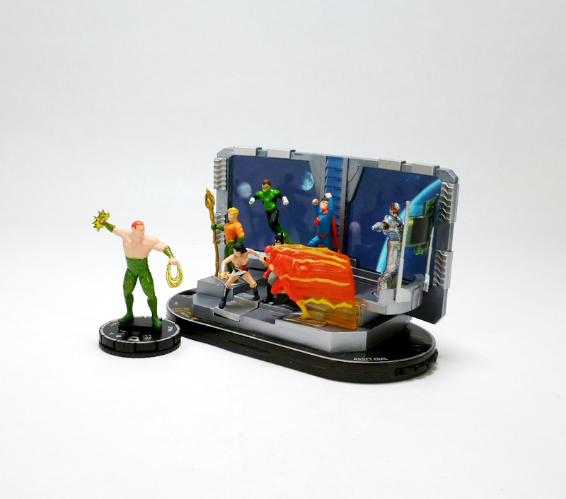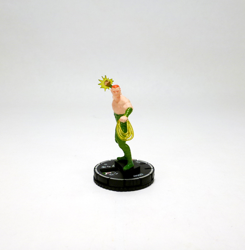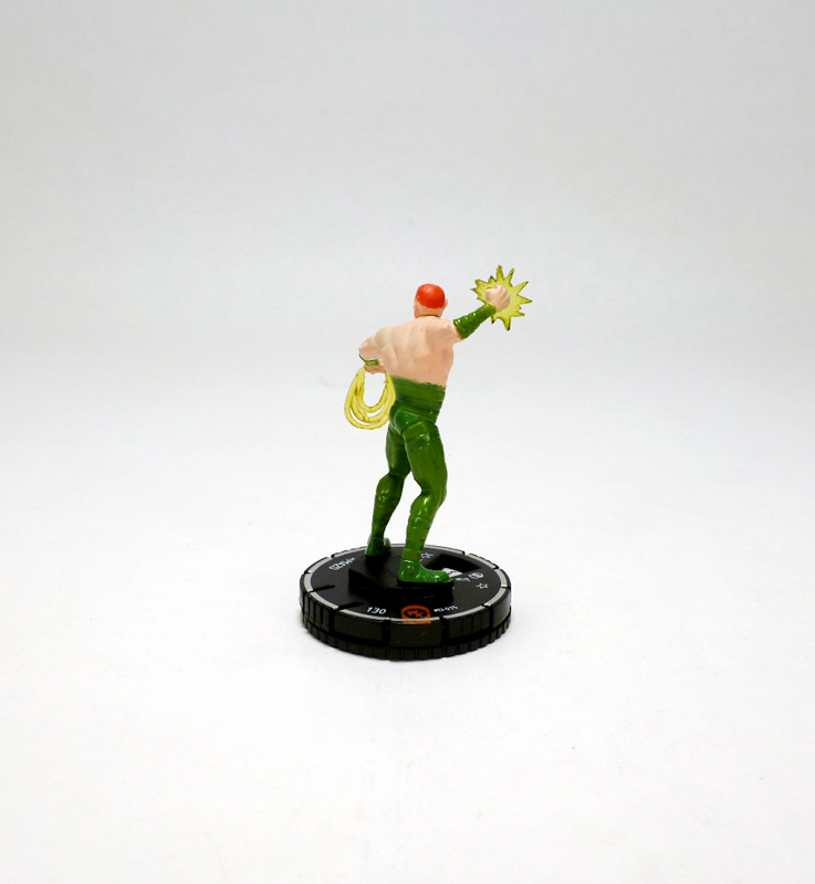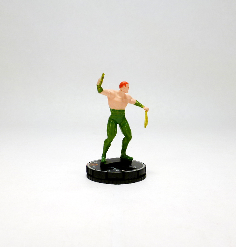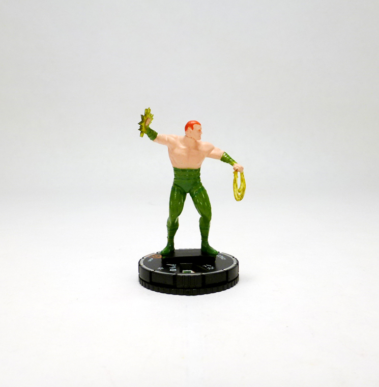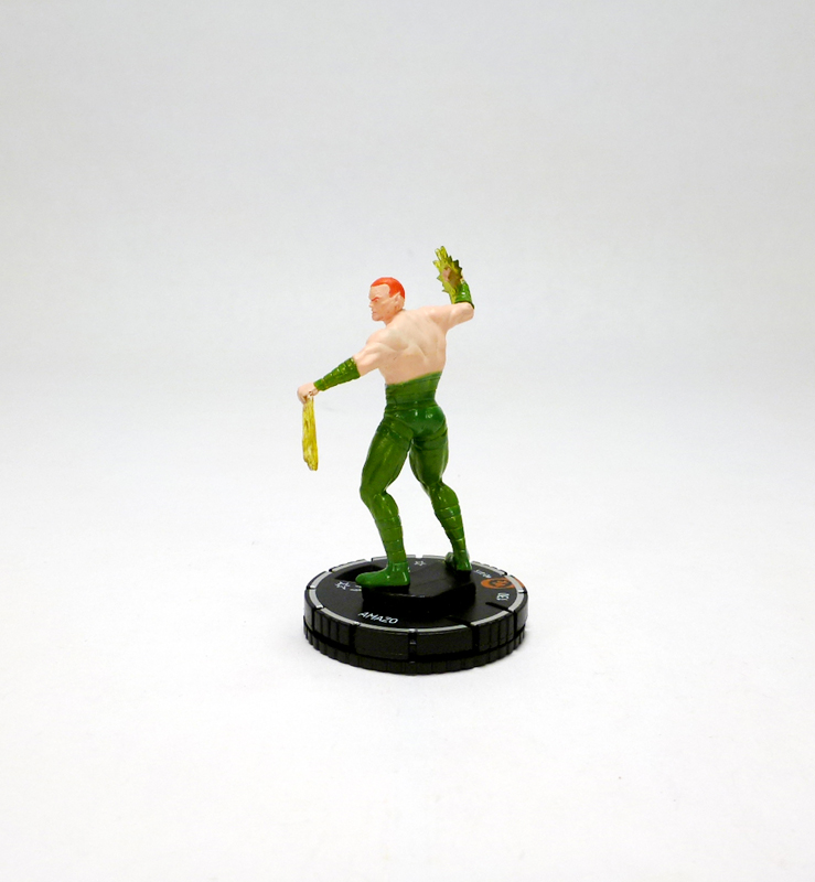 DC didn’t get any funny Con LE characters in 2014, but there is one that has a really unique trait: Amazo. This isn’t the android’s first rodeo in HeroClix as he’s appeared in the game twice before. Professor Ivo’s mighty android has never been quite so large and imposing in plastic, standing head and shoulders above many figures and looking “awesome.” Stealing the powers of the Justice League, the robot threatens his enemies with Wonder Woman’s lasso in his left hand with Green Lantern’s Power Ring energy enveloping his upraised right. Amazo is thickly muscled and wears his traditional green costume featuring bands at his waist and lower limbs while his hair, eyebrows, and eyes are bright orange. There’s a nice use of translucent plastic for the energy and lasso, and the detail is spot on down to the robot’s scowl and iconic pointed ears.