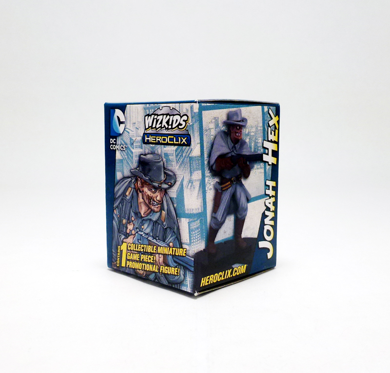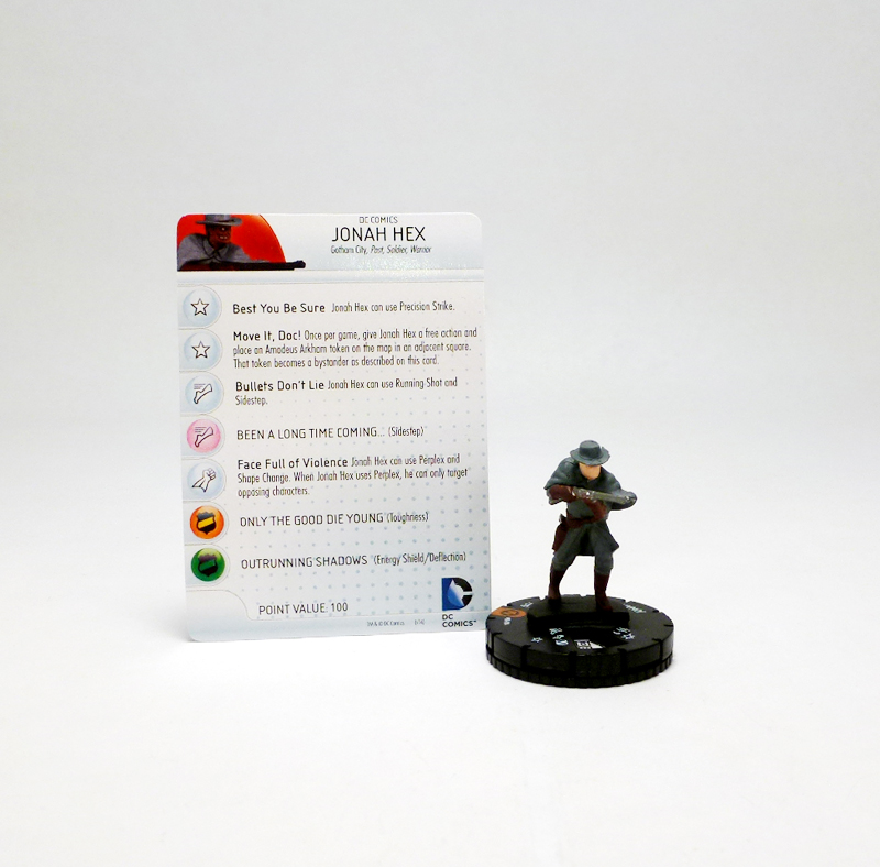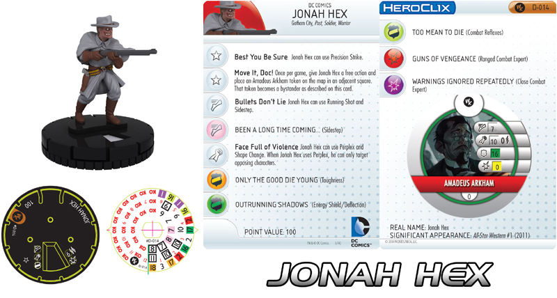 Jonah Hex started out in HeroClix at 46 points, and has gotten more expensive with each subsequent version. After the film’s 65 point star this LE is a full 100 points with Indomitable, a 6 range with two targets, one trait giving him permanent Precision Strike, and another trait that lets him summon an ally (we’ll get back to that one). His stats are about what you’d expect, starting out solid and dipping naturally except for his consistently good attack numbers. Hex begins play highly mobile with both Running Shot and Sidestep, and a second special power gives him Perplex to use on opponents and Shape Change on top of his Toughness. On his middle clicks the old timer gets regular Sidestep, Energy Shield/Deflection, and a touch of Ranged Combat Expert, while the end of his dial gets Hex ready for melee Combat Reflexes and Close Combat Expert. And let’s not forget that other trait! “Move It, Doc!” is a once per game free action to summon Jonah’s friend Amadeus Arkham who’s represented by a bystander token depicted on the back of Hex’s card. Dr. Arkham is notable for his 10 attack, 16 defense with Energy Shield/Deflection, and 0 damage Support to heal his friend. Finally, Jonah Hex has the Gotham City, Past, Soldier, and Warrior keywords.