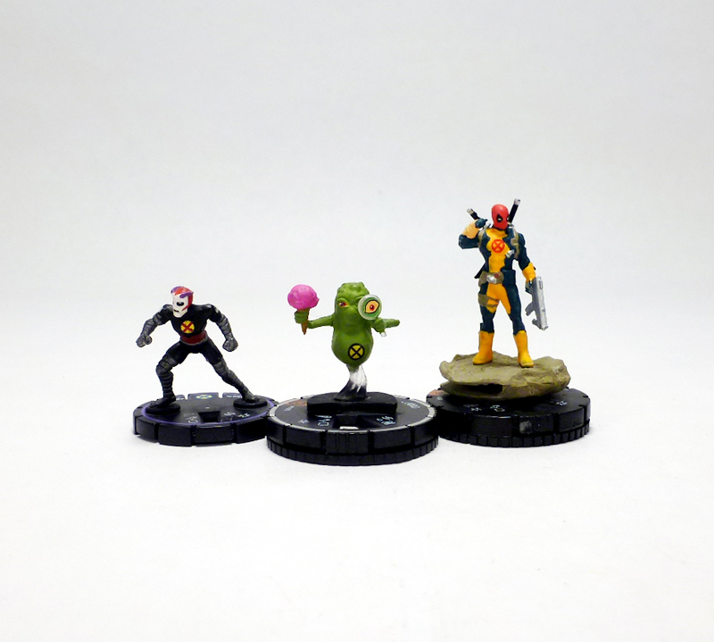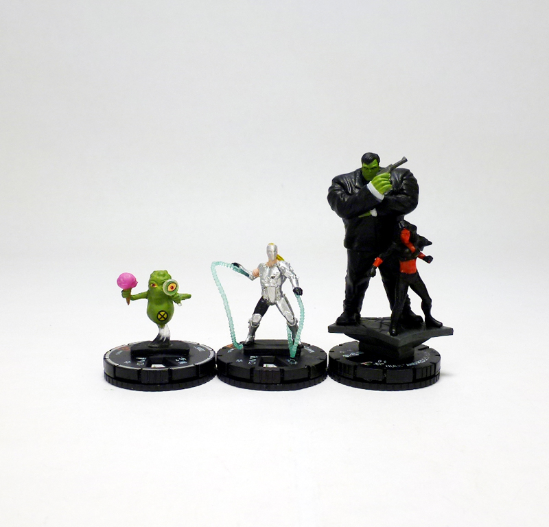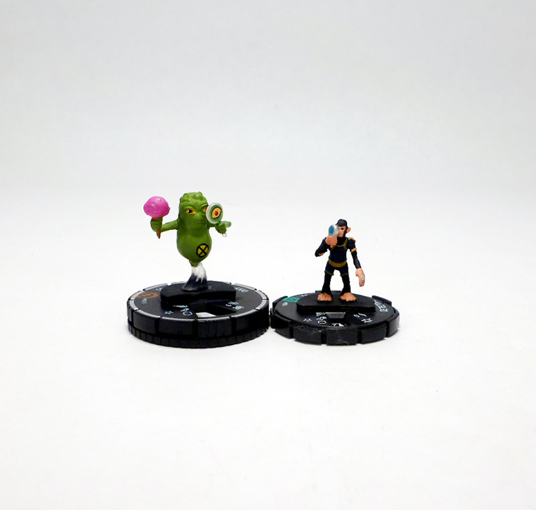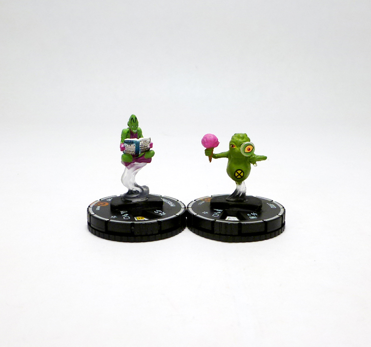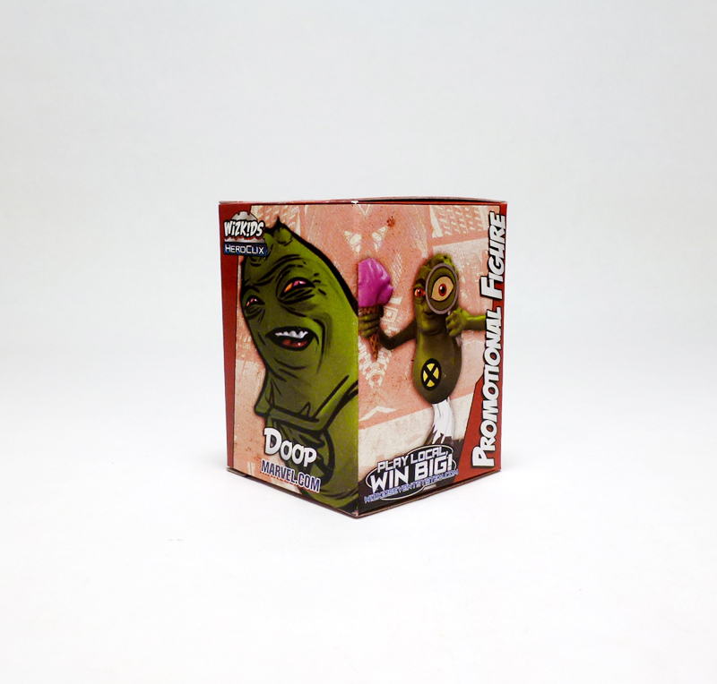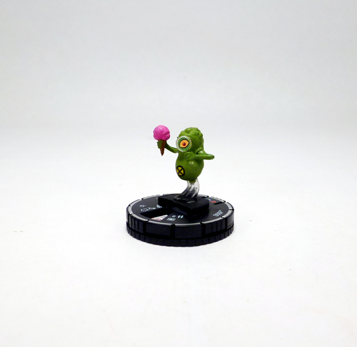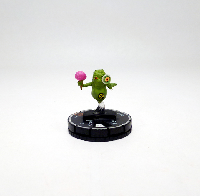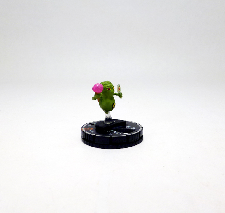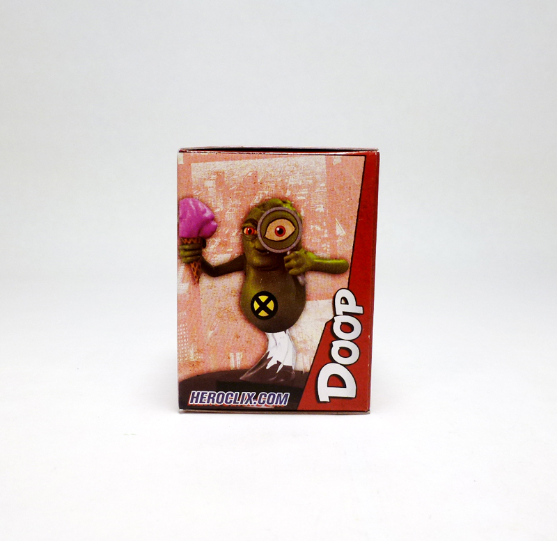There’s usually a “fun” character among the Con LEs (past examples have included Obnoxio and Bat-Mite), and this time around that distinction clearly goes to Doop! A unique, protoplasmic creature that’s still mainly a mystery, Doop has appeared in the pages of “X” books since 2001. The green character appears here for the first time in HeroClix with a pretty hilarious sculpt capturing him floating in the air, holding a big ice cream cone, and looking through a magnifying glass. He looks exactly as he does in the comics with a squishy body and bumpy head, X-Men logo on his belly and big yellow and red eyes. Doop appears to be enjoying some kind of bubblegum flavored pink ice cream, and his magnifying glass humorously enlarges his peeping left eye.