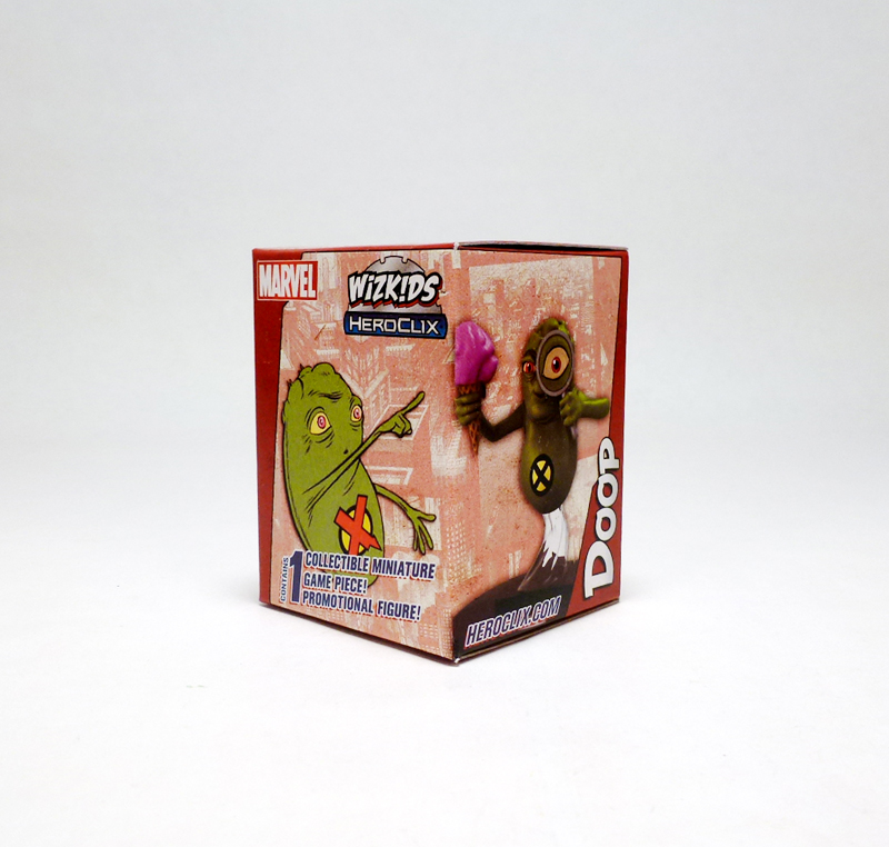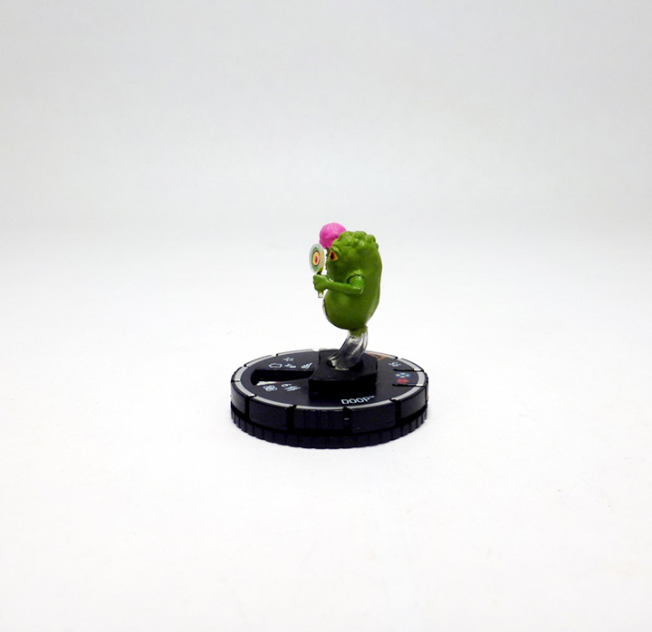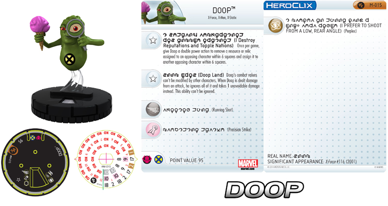 Much has been said about Doop’s dial, and it’s pretty interesting. The comic book character is clearly very powerful, but only uses his amazing abilities from time to time and they’re still very mysterious. Doop inclusion in HeroClix is 95 points, and that brings with it both X-Men and Power Cosmic team abilities, Flight, a 6 range with two targets, Tiny size, and two traits that let him switch a relic or resource on an opponent to a different enemy once per day, prevent his stats from being modified, and make it so that any successful attack on him deals one damage. His four click dial has good stats except for low damage, and only a smattering of powers. Doop starts with Running Shot and Precision Strike and ends with Perplex. The green thing has the X-Force, X-Men, and X-Statix keywords, and notably all of the entries on his card are written in Doopspeak!