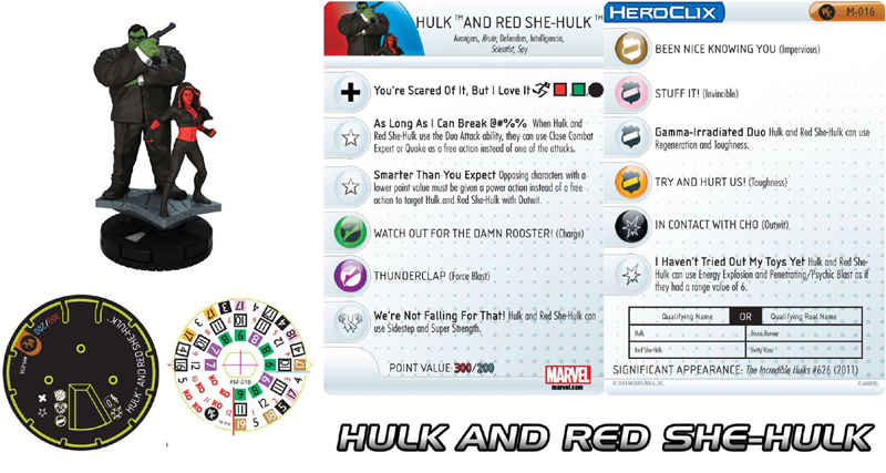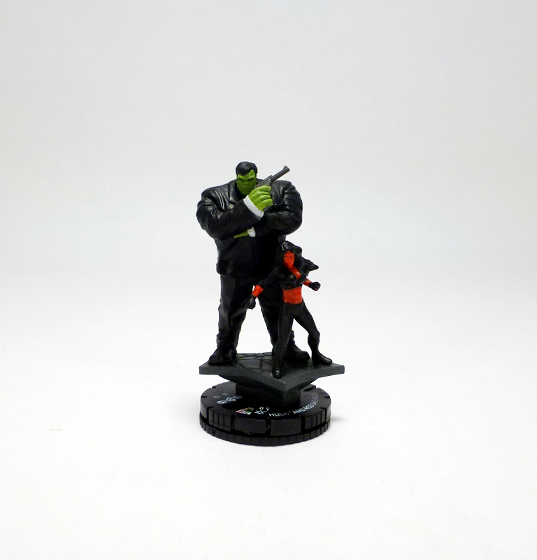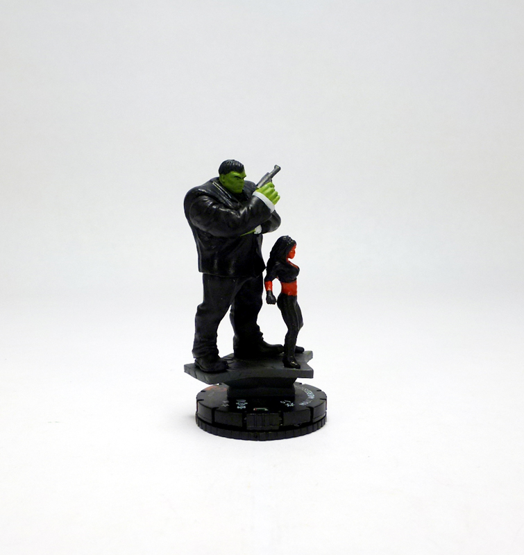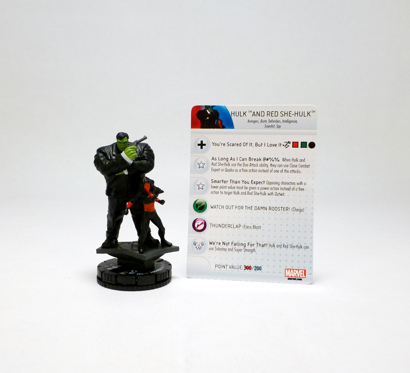 So what does the dial for these two Hulks look like? Well, there’s a lot going on. Their full dial is a massive 300 points which brings with it the Transporter symbol for Move and Attack, Duo, Indomitable, Improved Movement ignoring Elevated, Hindering, and Characters, and two traits that let them use Close Combat Expert or Quake instead of one of their Duo Attacks and makes lower point enemies Outwit them with a Power Action instead of a Free one. Whew, get all of that? Their 10 click dial has huge attack and damage numbers (never less than double digits and lots of 5s respectively), with good defense and average speed. In addition to the Move and Attack the Hulks have six clicks of Charge and four of Force Blast, and there are seven interspersed clicks of a special power giving them Sidestep and Super Strength. Defensively there are the anticipated Impervious and Invincible with some Toughness and two clicks of a second special power pairing Regeneration with Toughness (the first of which could potentially get them back up to click #2). On top of their already huge damage there are three clicks of Outwit and two with yet another special power, this one adding a ranged element that might surprise your opponent with Energy Explosion, Penetrating/Psychic Blast, and a 6 range! The Hulks might not be the strongest 300 point figure in the game, but they’re sure fun to play. You can also run them at 200 points starting on their fourth click, and they have the keywords Avengers, Brute, Defenders, Intelligencia, Scientist, and Spy.