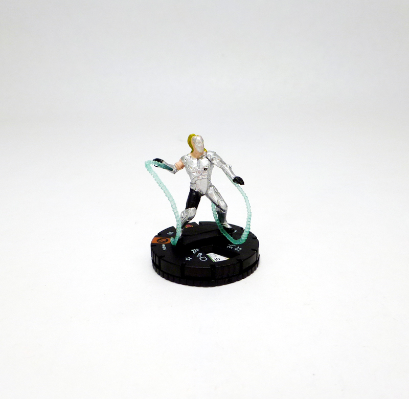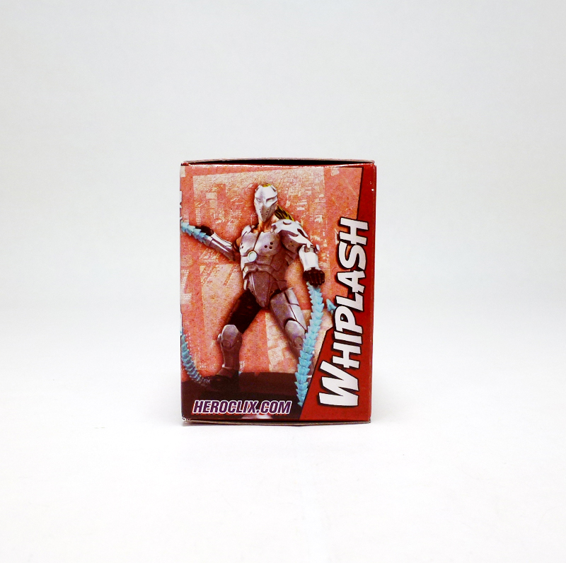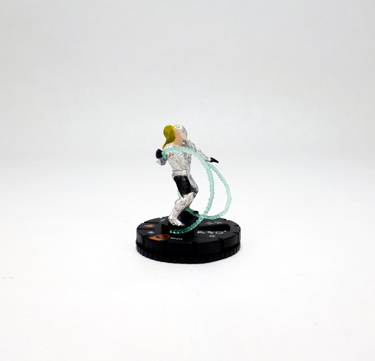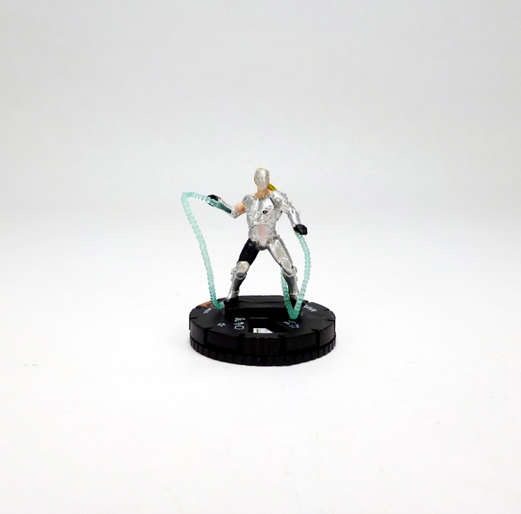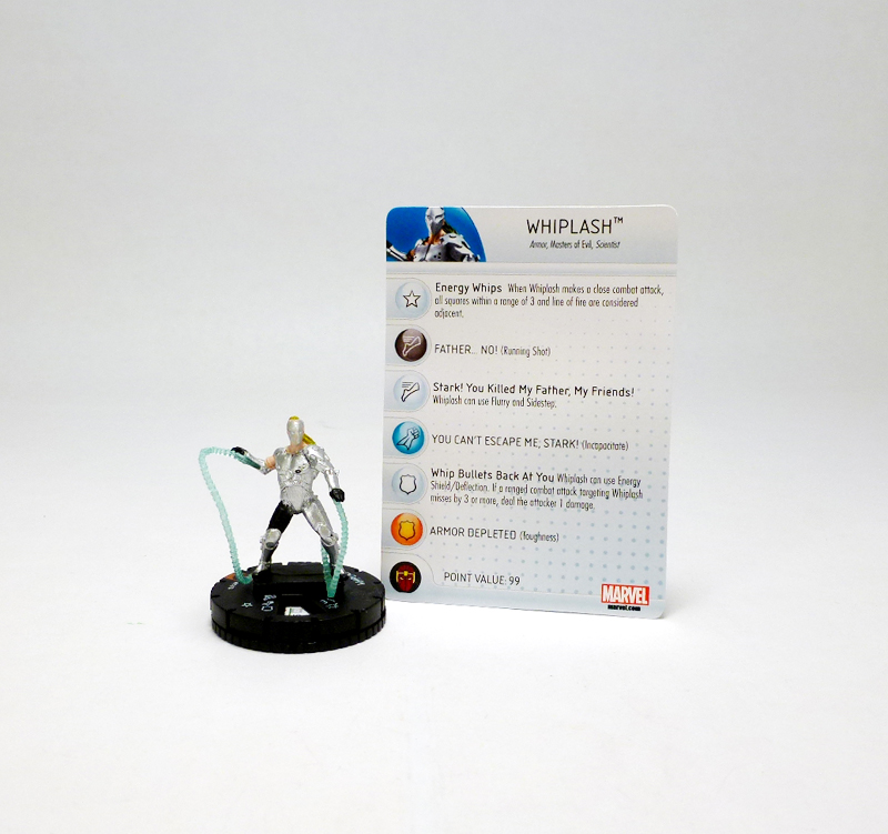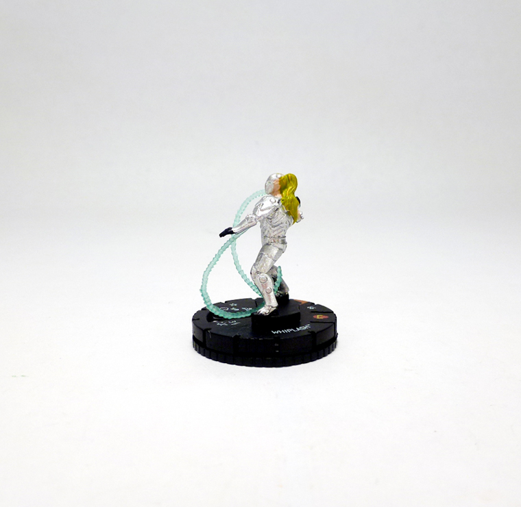 The next Marvel figure is another character making its debut in HeroClix, Whiplash! The current version in comics now is Anton Vanko, based on the character from 2010’s Iron Man 2 film. Fixated on Tony Stark after a rogue Iron Man suit is used to kill his father, Vanko uses stolen technology and his own to create a new suit with energy whips that gives him his codename. Whiplash cuts a menacing figure as he brings those weapons to bear! Wearing his homemade suit of armor, Vanko stands with his feet spread wide for balance as he slashes the air with his energy whips, one lowered in front of him with the other arcing by his side. The armor is bright silver with comic accurate black sections, and features quite a lot of intricate sculpted detail in the form of panels, overlapping plates, and more. Whiplash’s helmet looks great, and behind it flows his green ponytail/topknot. Of course, the coolest thing about this figure is his armament, and the whips are translucent blue plastic with a spiky, segmented texture.