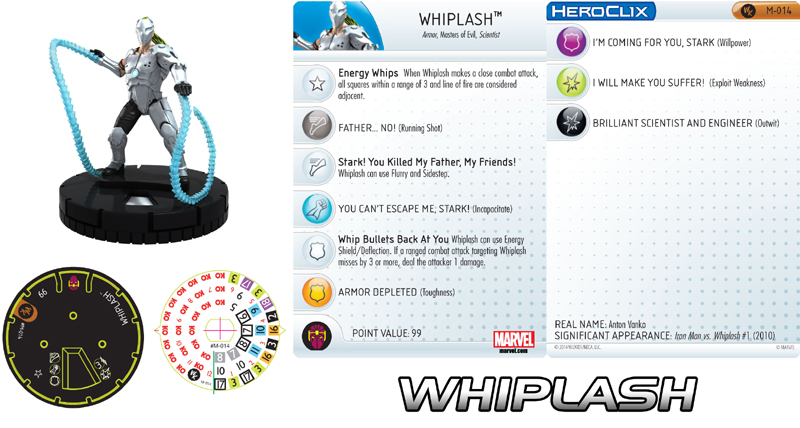 Whiplash is another team build-friendly LE at 99 points, just slightly more expensive than Doop. His dial top shows that for that investment you get the Masters of Evil team ability and a short 3 range, along with a trait that makes all squares in his range and line of fire “adjacent” for close combat attacks. Vanko is a murder machine for anything that happens to get within that three square area, with a combination of ranged and close combat options to get through different defensive powers. His dial starts with two clicks of Running Shot to get into position with an attack and Exploit Weakness to punish anyone in his area of effect plus a special defensive power giving him Energy Shield/Deflection AND dealing feedback damage to anyone who misses Whiplash with a ranged attack by 3 or more! Mid-dial Vanko switches to a combo of Flurry and Sidestep with Incapacitate, Toughness, and Outwit, and on his last clicks gets Willpower and a return to Exploit Weakness to make him deadly until the end. A great team player who can really affect the enemy’s mobility and movement, Whiplash plays best with allies who shares his keywords: Armor, Masters of Evil, and Scientist.
