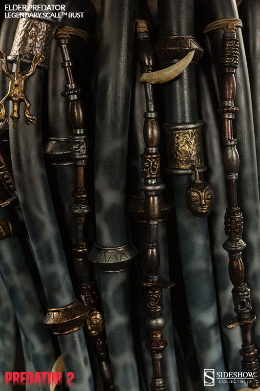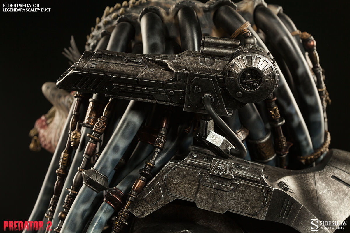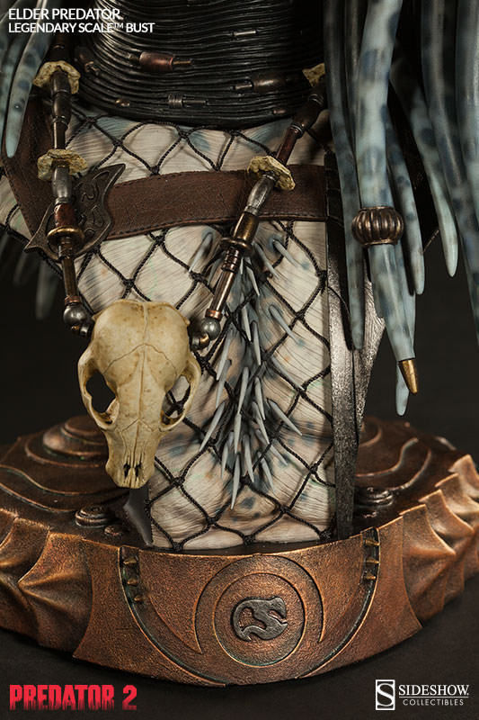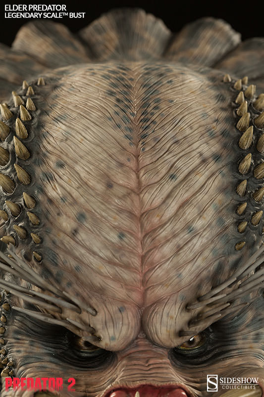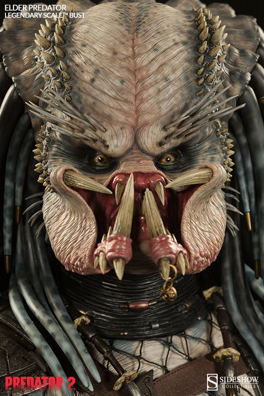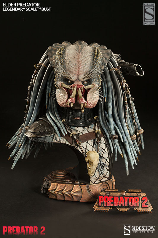 Sideshow presents the newest Predator to join their Legendary Scale Bust collection: the Elder Predator. This fan-favorite Yautja is sculpted as it appeared in Predator 2 with intricate tribal jewelry and shoulder-mounted plasma cannon. As with most all Sideshow Legendary Scale Busts, the exclusive edition will include an accompanying ‘Predator 2’ film nameplate (pictured below).
