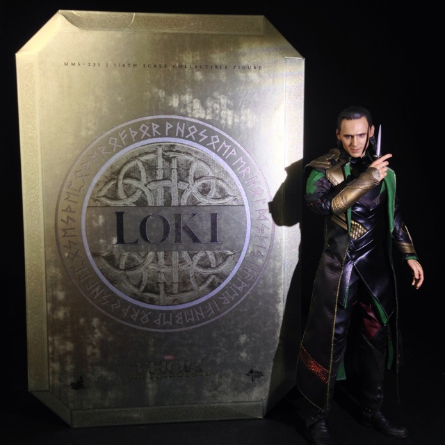 The packaging on this new version of Loki is quite a departure from most other Hot Toys figure releases to date. The box is made in the shape of Thor’s mystical hammer Mjolnir encased in a golden foil. The front of the box features a circular Asgardian symbol with Loki’s name in the center. The circular symbol is surrounded by Asgardian runes just like the ones inscribed on Thor’s hammer. The package features a white insert with an illustration of Loki sitting on Odin’s throne from the final scene of the film.