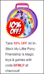Save On WWE, Beyblades, My Little Pony, Brick Arms, More!... Coupons valid through Monday, December 1, 2014. May not be combined with other offers. Only one coupon code can be applied per order, due to shopping cart limitations.