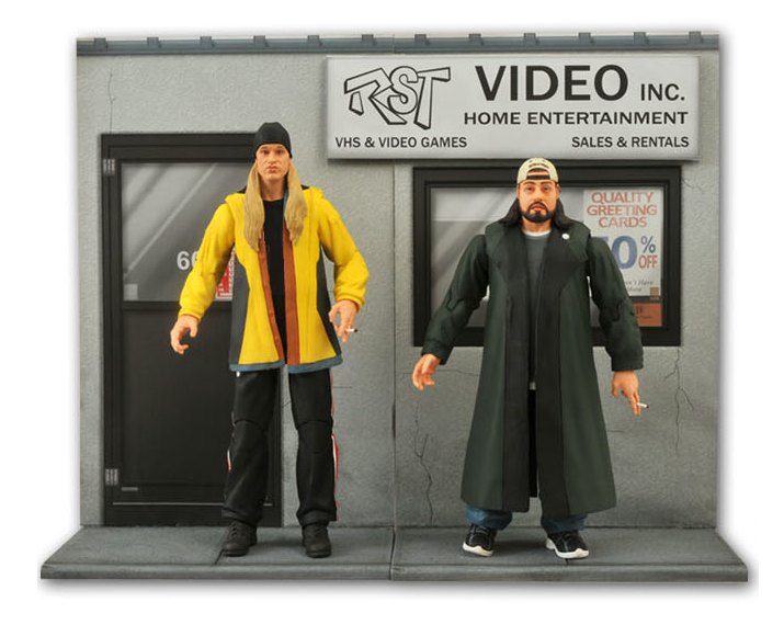 It's been 20 years since we met Jay & Silent Bob in Clerks, and DST is celebrating the less-than-dynamic duo's anniversary with their most realistic action figures ever! Based on their appearances in Jay & Silent Bob Strikes Back, these 7-inch scale figures feature multiple points of articulation and the likenesses of Kevin Smith and Jason Mewes, and include interchangeable heads and hands, as well as connecting display bases depicting the interior and exterior of RST Video. Packaged in Select-style display packaging, with spine artwork. Sculpted by Patrick Piggott!