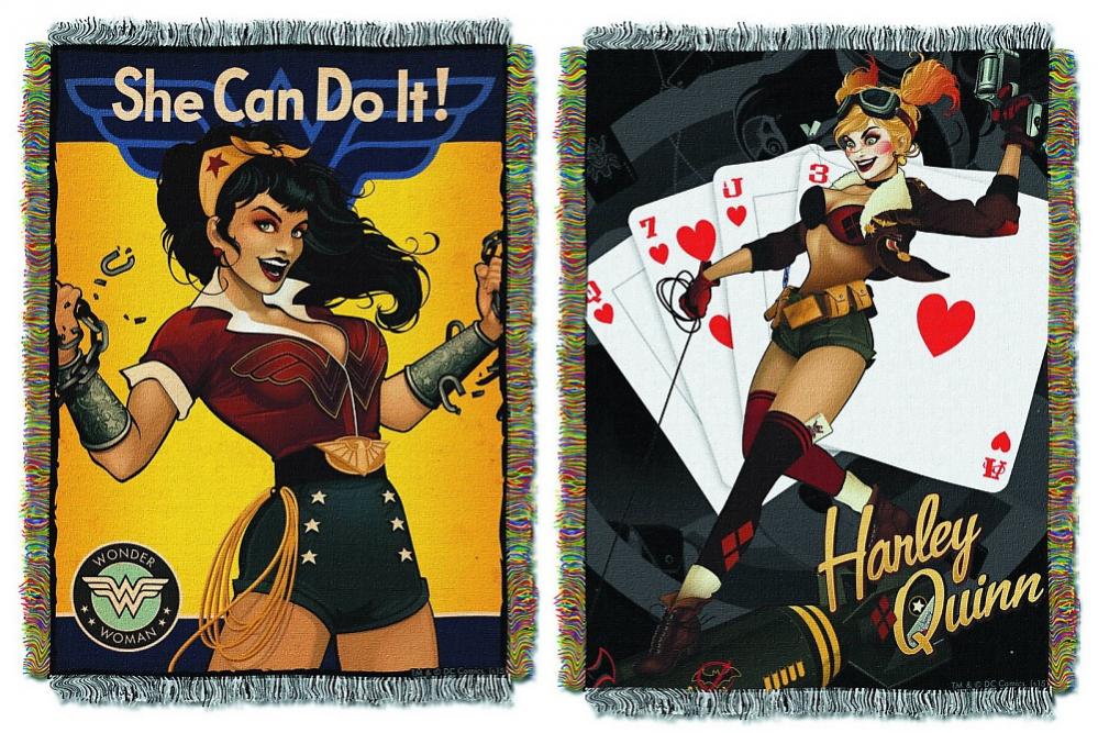 Get comfortable and curl up with your very own DC Comics Bombshell Harley Quinn or Wonder Woman tapestry blanket! Each blanket measures 46"x60", is made of soft acrylic, and carries vivid detail of everyone's favorite Queen Clown Harley Quinn or Can-Do Wonder Woman both featured in their Ant Lucia Bombshell costume.