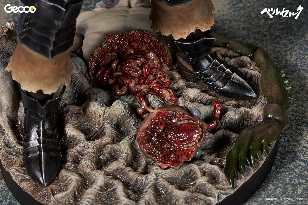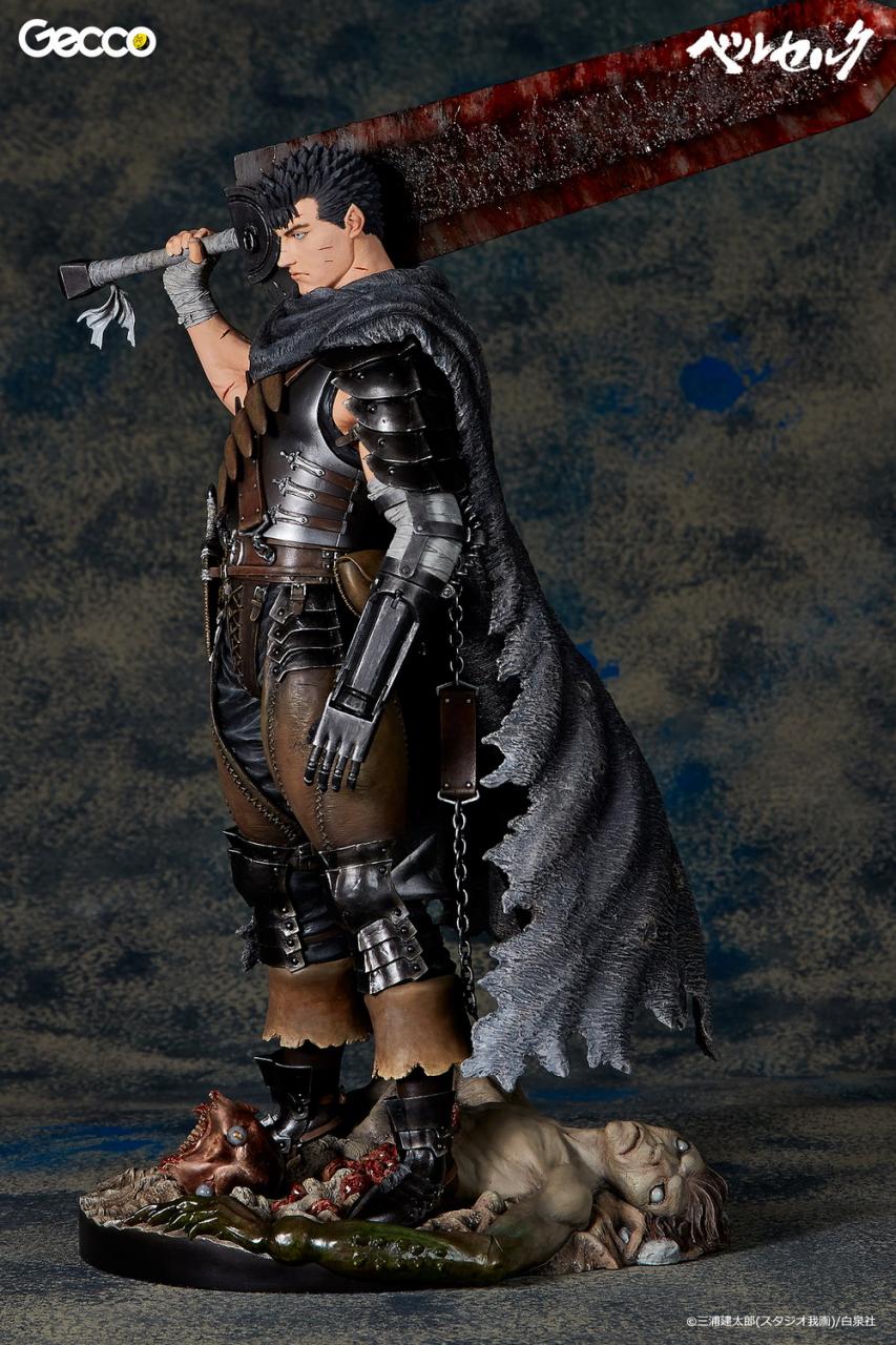 Japanese figure manufacturer Gecco (gecco.co.jp) shares with us their latest release: a 1:6 scale PVC statue of The Black Swordsman, "Guts" from the hit fantasy anime and manga series, Berserk. Measuring approximately 15 inches tall (38cm), the detailed sculpture captures the powerful attitude of the character, Guts' giant sword "Dragonslayerh" resting on his shoulder. His freshly used sword, along with the slain "Apostle Spawn" on the base below, create a tense atmosphere.