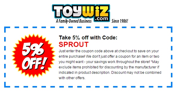 [SIZE=2]ToyWiz.com has thousands of in-stock items. Use the coupon code SPROUT and receive 5% off your purchase! Shop from an incredible selection of the newest and most popular action figures, toys, and collectibles including: