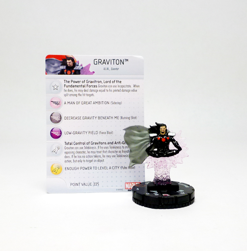 The classic Graviton was a powerhouse boasting an incredible 12 range with three targets, great powers, and solid stats (for the time, and even now his damage track is enviable for 178 points). So let’s take a look at the newcomer. Age of Ultron Graviton is 47 points more expensive and comes loaded with Flight, Indomitable, a respectable 9 range with three targets, and a trait giving him permanent access to Incapacitate that also does damage! An eight-click dial boasts a lot of high numbers, especially in attack and damage (like his previous version). Graviton’s dial is broken up into three sections starting with Sidestep, a special power giving him Telekinesis that counts enemies as allies for movement and gives the free movement of objects when he has no action tokens, and Invulnerability. On click #3 the villain gets really mad and switches to Running Shot, a 12 attack Pulse Wave, Impervious, and a 5 damage with another special power locking the speed of enemies given an action within 5 squares at a 3. The “Master of the Fundamental Force” sees on his last three clicks Force Blast, a lethal three-target Energy Explosion, and a third special power granting Energy Shield/Deflection and Toughness. Leaving 75 points for support Graviton can be really effective in a 300 point game, and he pairs up best with figures sharing his A.I.M. or Scientist keywords.