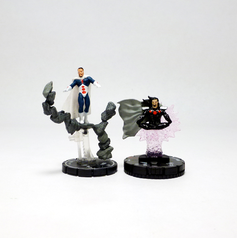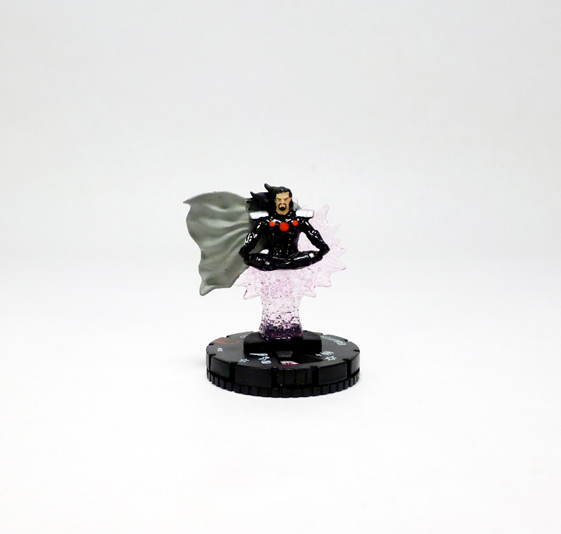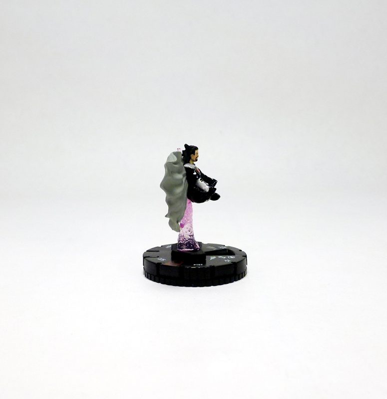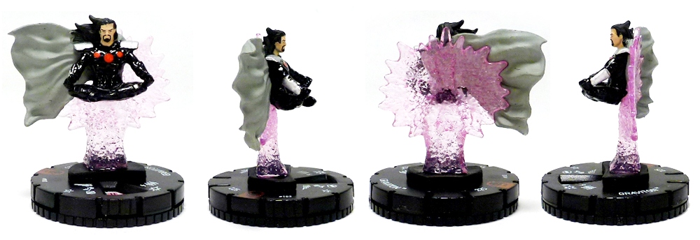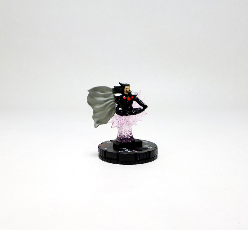 Graviton has appeared in HeroClix just once before as a Unique character in 2006’s Marvel Supernova set, and while dated his sculpt still looks cool with the figure standing on a string of rocks rising from his base and extending upwards around him. The new Graviton, though, exudes a Zen-like cool that takes him to a whole different level. The villain hovers in the air, sitting cross-legged with his hands resting on his knees. Behind him is a column of translucent pink energy that holds him up and explodes into a nova, and the altitude, weather conditions, or just his power makes his hair and cape flutter to the side. Graviton wears an updated costume consisting of a black bodysuit with silver shoulder pads and forearm guards plus three red circles on his chest. The figure looks great, especially the movement in the cape and hair, the texturing on the energy effect, and the excellent paint job highlighted by Graviton’s goatee and eyes.