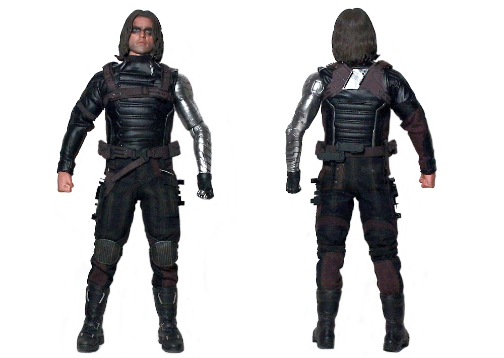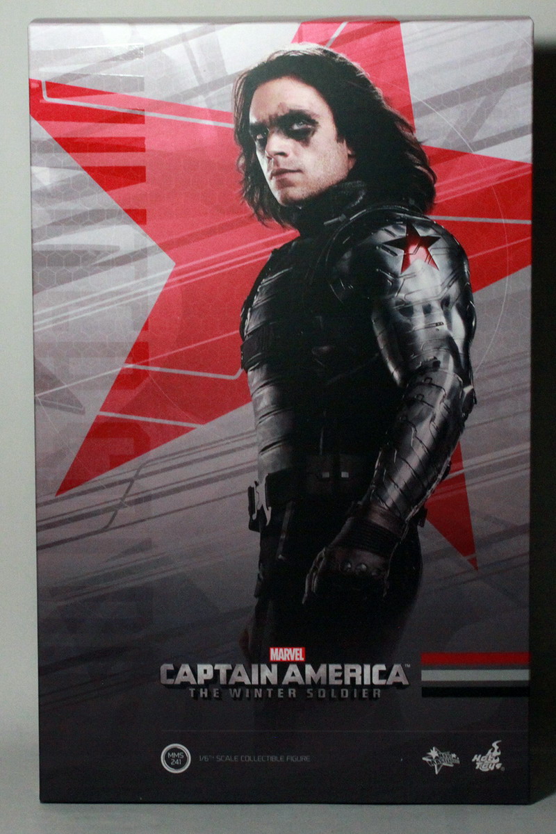 The packaging shows a production still of Sebastian Stan as The Winter Soldier, a large red Soviet star behind him and the crew of Hot Toys on the back. The box is sturdy, keeping contents safe for the most part. Inside is an insert sleeve with a photo of the Hot Toys Winter Soldier and below that, multi-layers of trays containing the figure, accessories, and display stand. There are no twist ties but there is tape and plastic wrapped around the hands and feet. Sometimes I’m lucky to pull them right off but sometimes they’re a real pain.