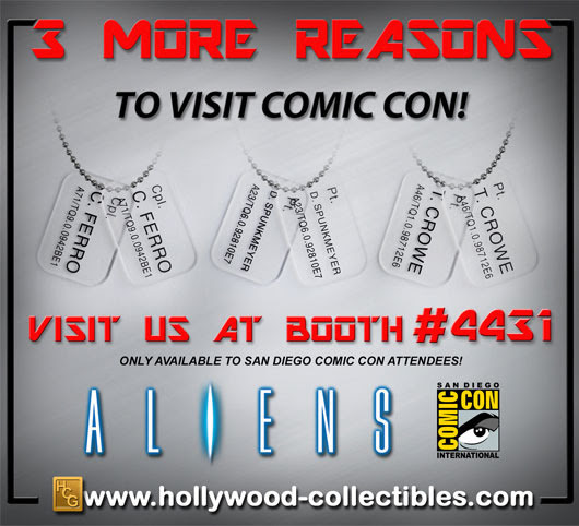 Hollywood Collectibles Group (HCG) is offering three new Colonial Marine Dog Tags as San Diego Comic-Con exclusives. Worn by the tough and ready soldiers in 1986's ALIENS, the exclusives tag replicas represent Spunkmeyer, Crowe and Ferro. They will be sold at HCG's booth #4431 priced at $19.95 each, or $50 for all three.