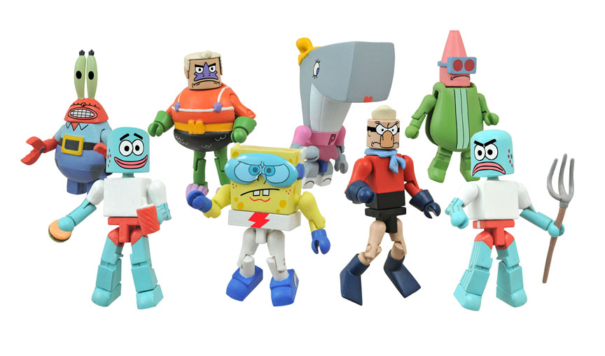 Mermaid Man and Barnacle Boy… UNITE! The superheroes of SpongeBob SquarePants’ undersea world have joined the SpongeBob Minimates line, and this assortment couldn’t get any more super! Super-chums Mermaid Man and Barnacle Boy make up one 2-pack, with another dedicated to Super Acquaintances SpongeBob (as Quickster) and Patrick (as Elastic Waistband). Mr. Krabs’ daughter Pearl comes with happy fish Harold, plus be on the lookout for a rare, one-per-case 2-pack of Robot Mr. Krabs with an angry Harold! Each Minimates mini-figure features up to 14 points of articulation as well as interchangeable parts and accessories, and each 2-pack comes packaged on a full-color blister card. Designed by Art Asylum! (Item #JUL152203, SRP: $9.99/ea.)