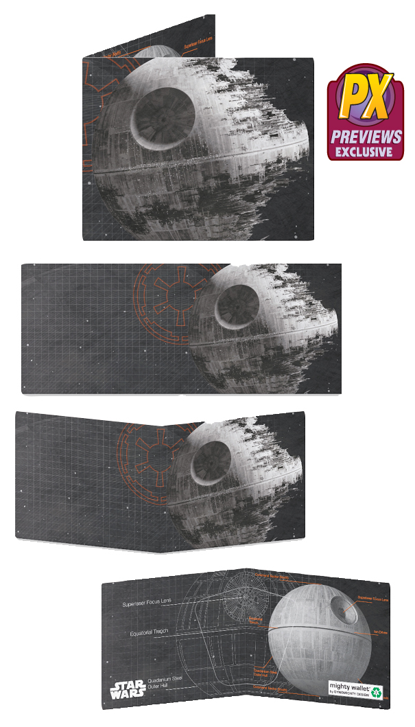 Star Wars fans can also keep their money secure and in style with two exclusive Mighty Wallets designs. Feel like Jabba securing your treasure with a “Han Solo in Carbonite” wallet featuring a print of everyone’s favorite smuggler frozen in his Carbonite prison (Item code NOV152249). Though who lean toward the dark side can get the “Death Star Schematics” Mighty Wallet, which features the new in construction Death Star from Star Wars: Return of the Jedi on the outside, but when opened up reveals the plans for the completed battle station (Item code NOV152250).