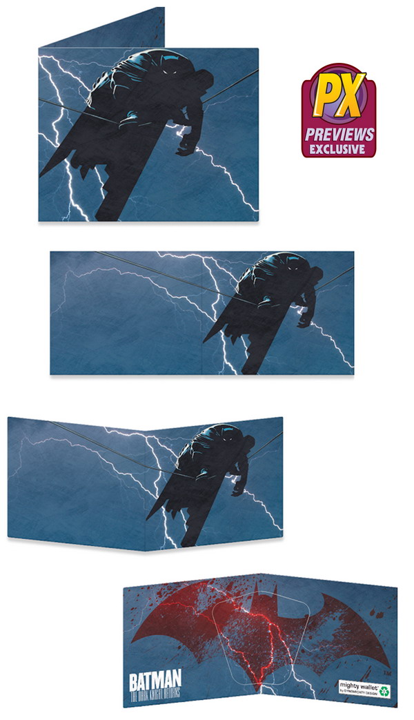 Fans of the revolutionary The Dark Knight Returns mini-series by Frank Miller can carry around their love of Batman with two wallet designs. The “Dark Knight Strikes” design (Item code NOV152167) features the cover art from the 10th anniversary edition of The Dark Knight Returns, which depicts Batman crouching on a powerline with lighting crashing in the background. The second design, the “Dynamic Duo” wallet (Item code NOV152168), features Bruce Wayne as Batman and Carrie Kelly as Robin leaping through Gotham.