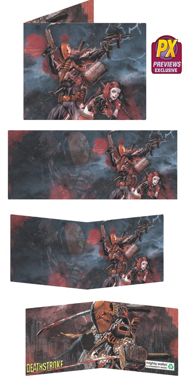 DC Comics fans can also purchase a PREVIEWS exclusive Mighty Wallet featuring assassin Deathstroke and fan-favorite villain Harley Quinn, posing against a bloody grey sky (Item code NOV152730).
