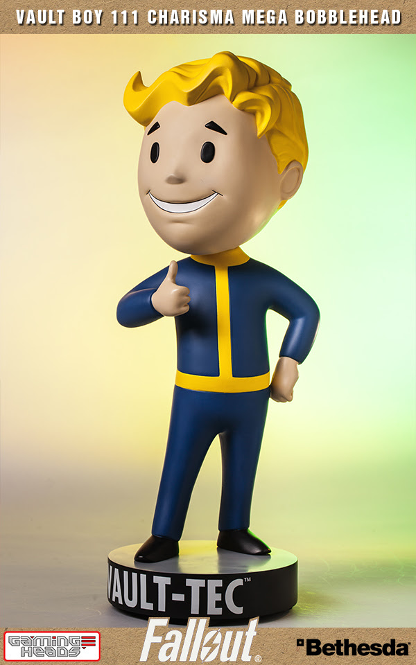 After a successful series of standard Fallout bobbleheads, Gaming Heads presents their first Mega Bobblehead! The Fallout 4: Vault Boy 111 Charisma Mega Bobblehead stands 15 inches tall, which is approximately 3 times of the size of Gaming Heads' original Fallout bobbleheads. It is made using polystone resin and depicts Vault Boy in his iconic thumb up pose. And yes, the Vault Boy 111 Charisma Mega Bobblehead head really does bobble!