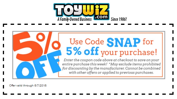 ToyWiz.com has thousands of in-stock items. Use the coupon code SNAP and receive 5% off your purchase! Shop from an incredible selection of the newest and most popular action figures, toys, and collectibles including: