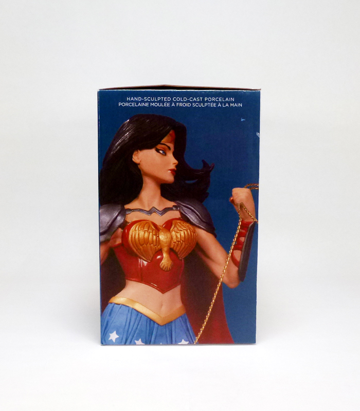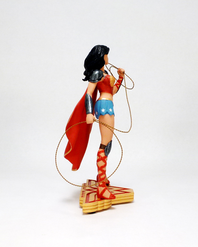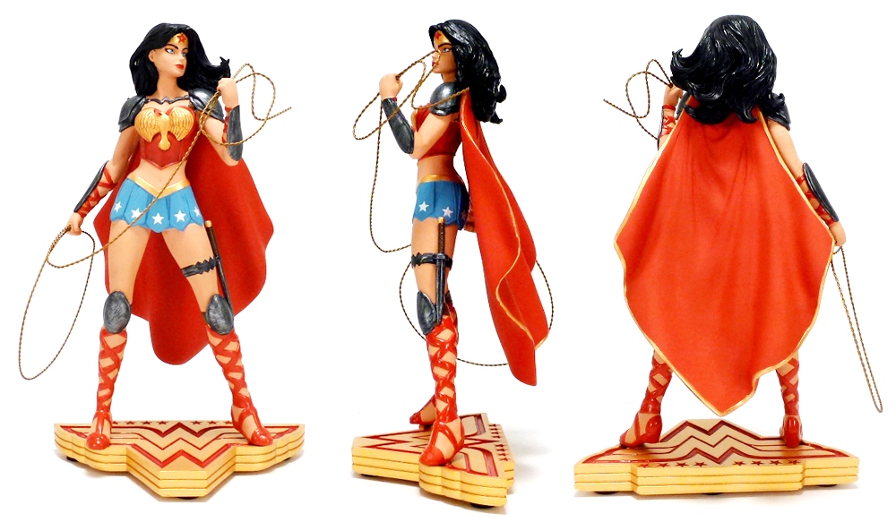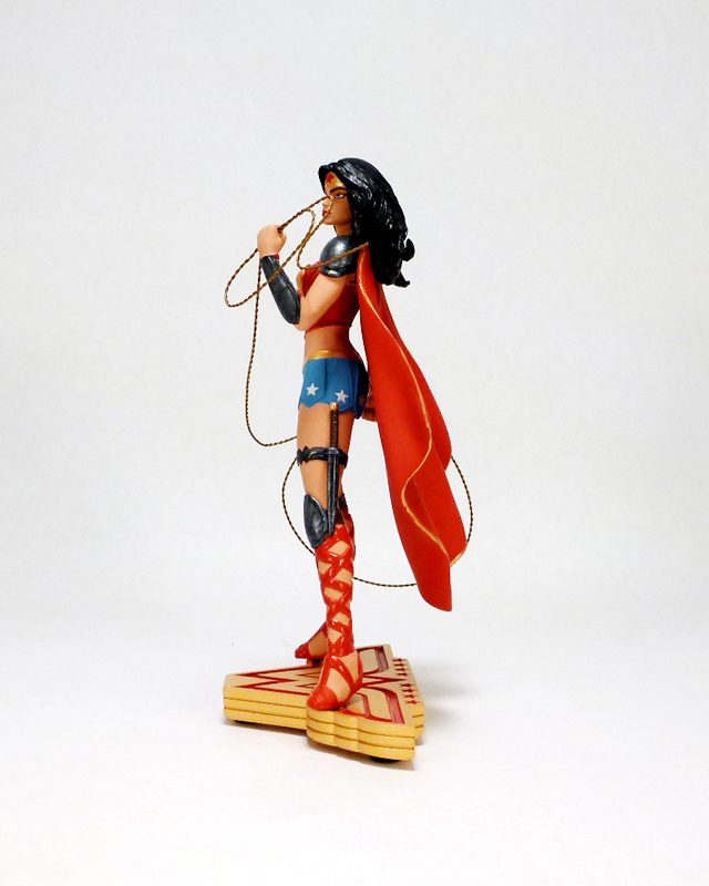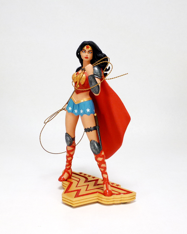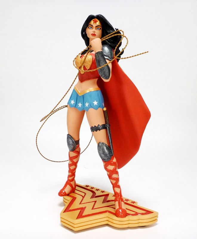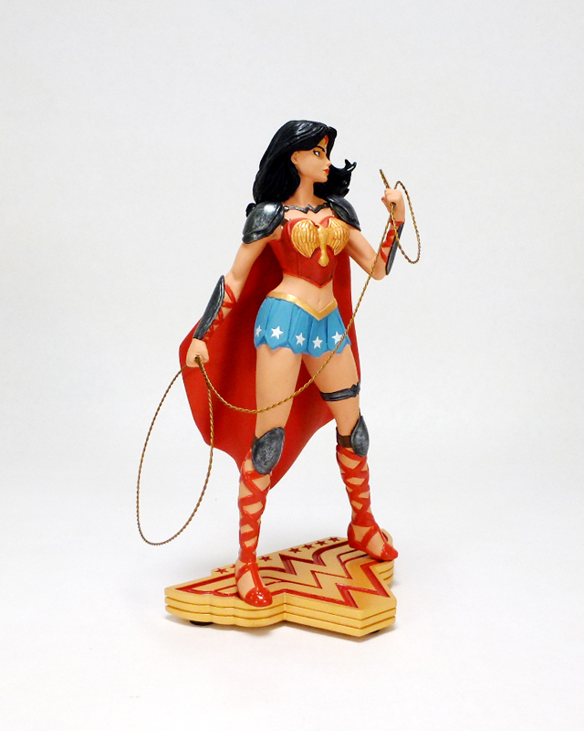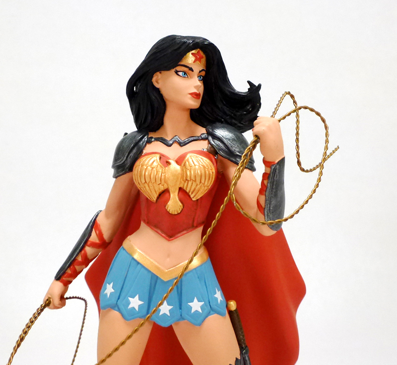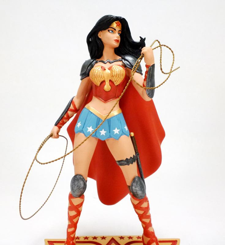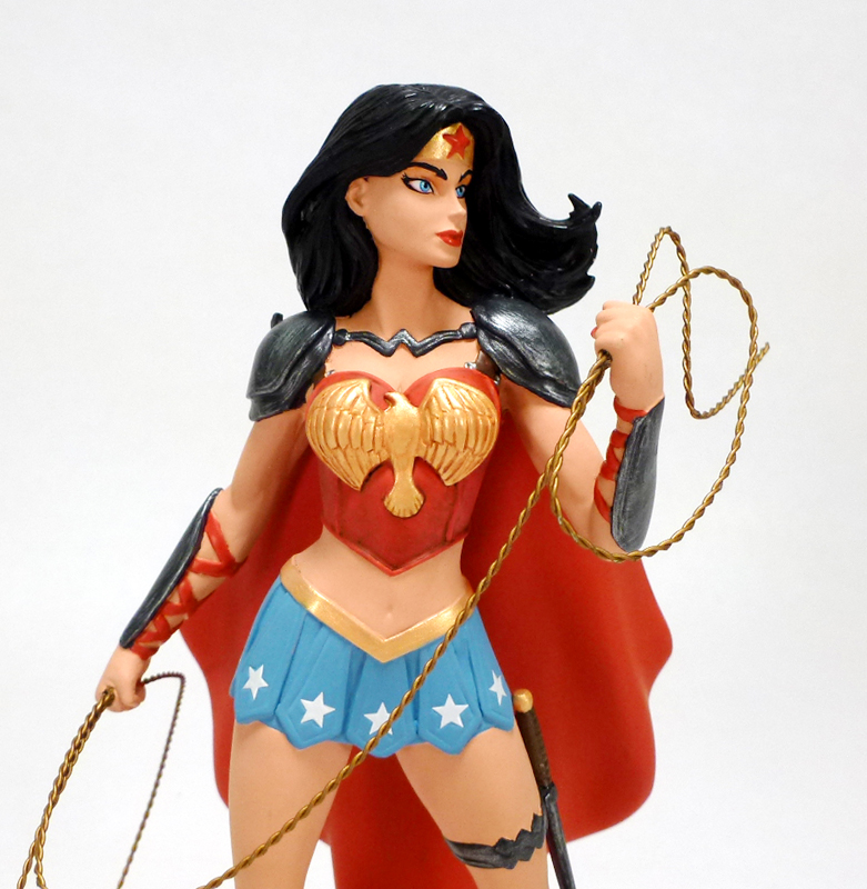 All of the Art of War statues are hand-sculpted and fully painted, made from cold-cast porcelain, and stand on Wonder Woman-themed display bases. That, though, is where their similarities end. With visions of Diana Prince from such luminaries as Jim Lee, Adam Hughes, George Perez, Cliff Chiang, and more each one is a unique presentation from the overall style to the pose, costume, weapons, etc. David Finch’s take on the character is clearly a strong warrior, striding on the battlefield with some extra armor protection and armed first and foremost with her magical lasso. Wonder Woman stands with her legs spread apart for balance and she twists slightly and looks to her left at some unseen foe. She wields the Lasso of Truth with both hands, the right held down at her side and the left defiantly up in front of her. Diana wears a unique version of her costume with an eagle-decorated breastplate, pleated skirt with stars, sandals strapped to the knees, and a great billowing cape. She also adds armor plates at the shoulders and knees with matching bracers instead of bracelets. A short sword is strapped to her left thigh and her tiara rests on her forehead.
