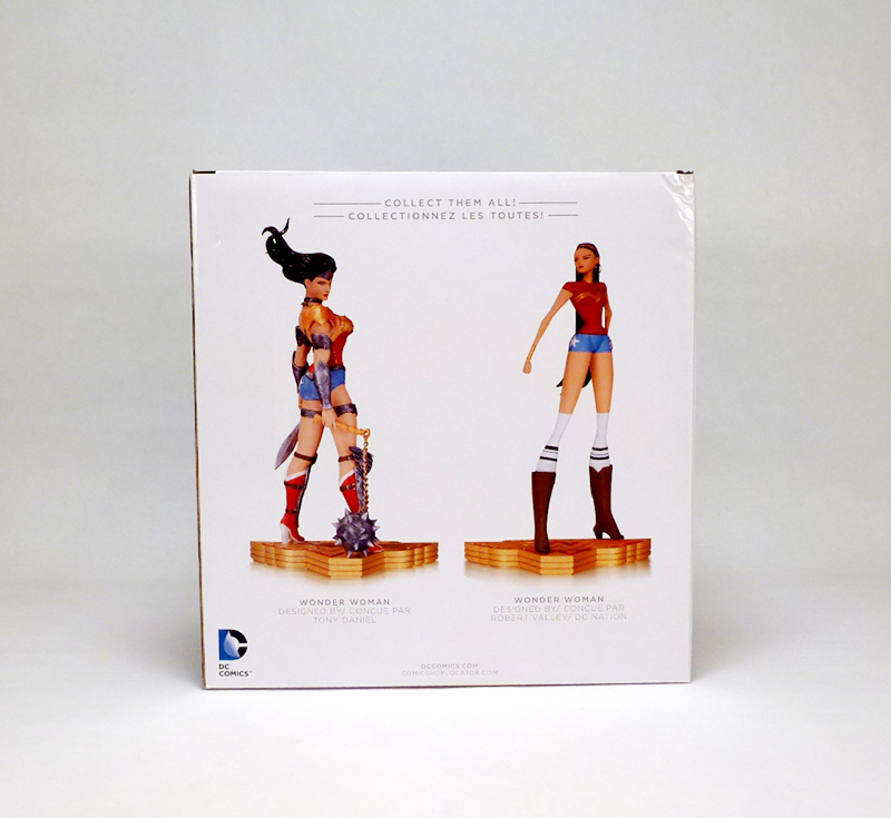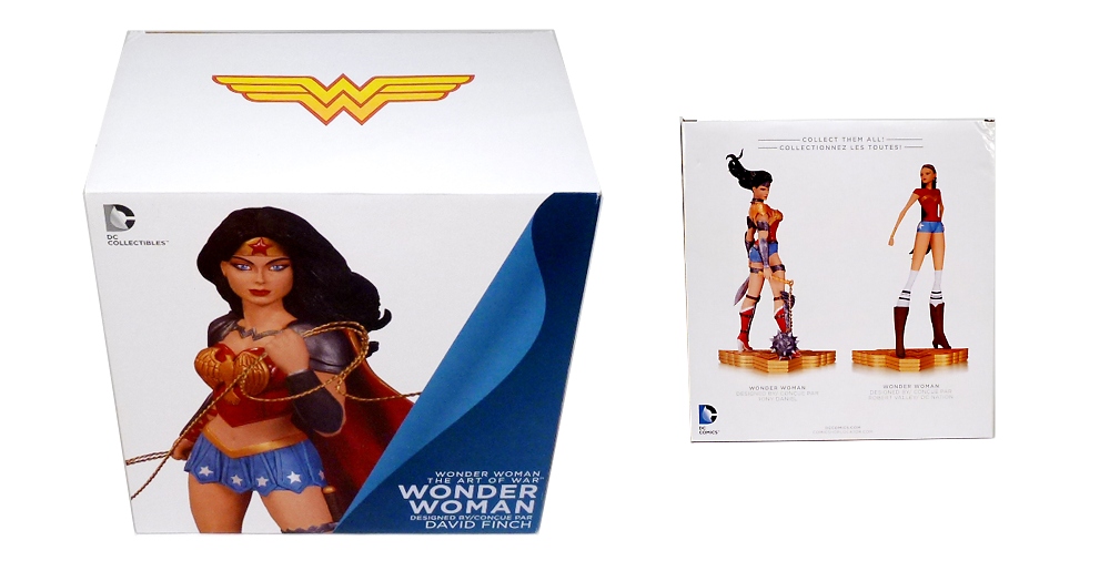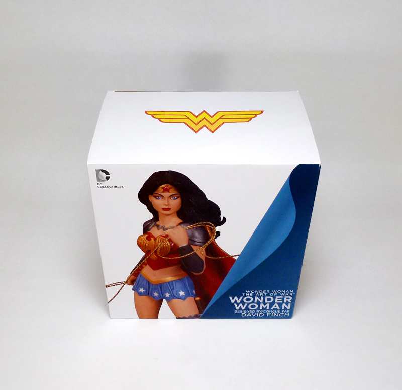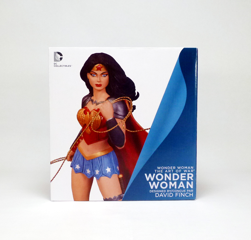 The new Wonder Woman Art of War statue comes in a sleek box that fits in with DC Collectibles’ current packaging aesthetic. The front panel features a close up of the statue on the left, revealed by the “peel” of the blue DC logo pulling toward the right. The name of the statue and its designer are on the bottom-right. The box’s sides have more photographs of the statue on display and additional information like the construction and the sculptor (Clayburn Moore in this case), while the back panel shows off two other figures in the series: Tony Daniel and Robert Valley/DC Nation. Lastly, the top of the box has a bright Wonder Woman logo so you’ll know exactly who’s inside if you can’t see the other panels. As always the packaging is sophisticated and really highlights the shots of the statue without a bunch of jarring graphics.