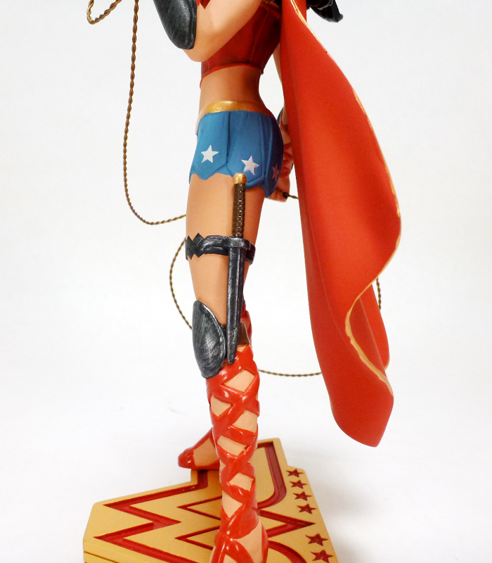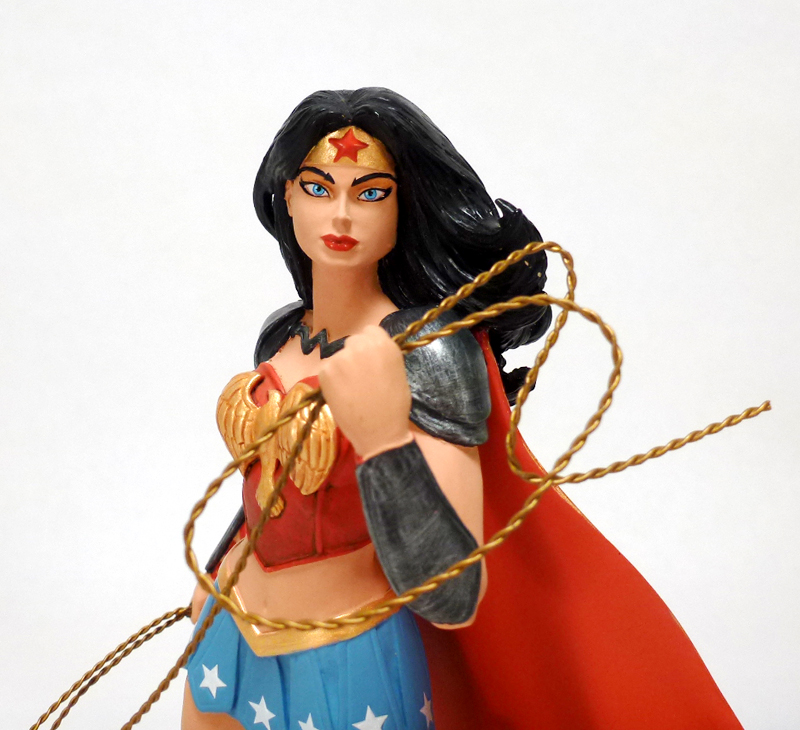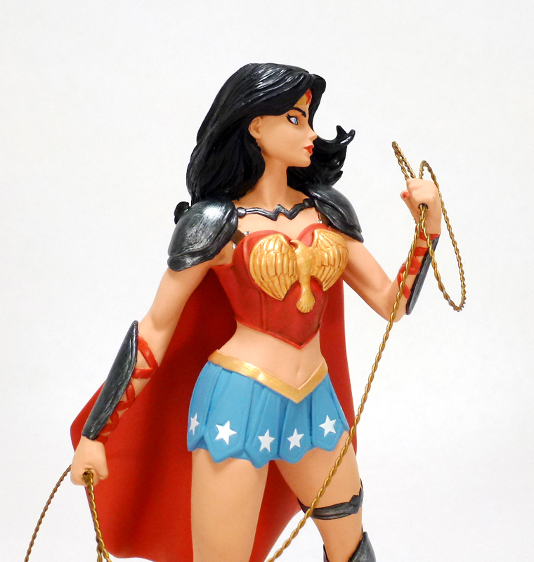 Even at first glance you can tell that this statue has a really nice sculpt, thanks to the always awesome Clayburn Moore, and there’s a nice contrast between the smoothness of Wonder Woman’s skin and the textures and layering of her clothing. Her pose reads confident, powerful, and beautiful rather than sexy, and that does nothing to diminish the impact it has. The straps of the sandals and bracers are nice and thick, the pleats of her skirt well defined, and the eagle on her chest highly detailed. There are lots of really small accents too like the buckles and straps attaching the breastplate to the shoulder armor and the twisted strap holding the sword on her thigh. Diana’s face has a Greek look to it (at least it appears that way to me) with a narrow nose, full lips, and huge expressive eyes with thick eyelashes. Her hair is large and in charge as well, falling behind her head and wafting forward in the same breeze that ruffles her awesome cape. Of course I have to mention her sweet lasso, a twisted cord with loops and trailing end.