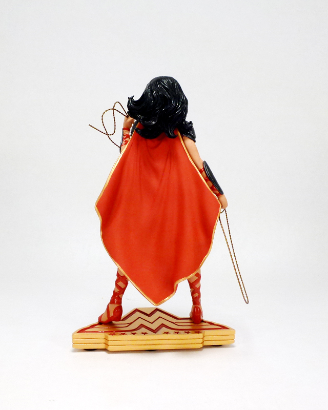 While the similar Batman statue series from DC Collectibles evokes the Dark Knight’s world with black and white only, Diana lives fully in the world of men and gods and is presented in living color. The full effect is red, blue, and gold with splashes of darkness from her armor and hair. Wonder Woman’s skin tone is a nice olive shade (somewhat hard to photograph) with dark red used on her breastplate and cape with a slightly lighter hue on her straps. Gold is strategically placed on her chest-mounted eagle, tiara, the pommel of her sword, and the trim on her skirt and cape. The bright blue on the aforementioned skirt is really eye-catching in the middle of the statue, especially with the added white stars. Wonder Woman’s lips are a deep, glossy red while her prominent eyes are a cool blue. Small details bring in other colors like brown on the sword handle and the near-hidden straps of her shoulder armor, and at the latter there’s a dash of silver on the buckles.