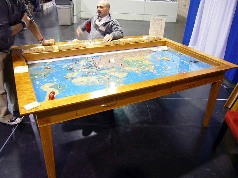 What caught my eye first were the huge "Spartan" gaming tables. The Spartan surrounds a high-quality sunken gaming surface with a heavy duty table complete with side rails to accommodate a huge variety of accessories (like various compartments, drink holders, dice holders, etc.). The gaming surface can then be covered by flat leaves for any other use. Beneath the gaming table is also a huge storage area for all of your gaming supplies and miniatures. Similar to the Spartan is the "Emissary," a dining room table that doubles as a gaming table complete with hidden desks, more storage, and plenty of expandability with the same rail and accessory system.