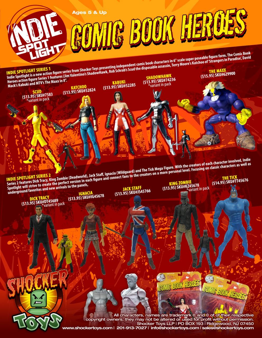 Series 1 (in stores now): 6-inch scale figures of Jim Valentino’s ShadowHawk (and black costume variant), Rob Schrab's SCUD, The Disposable Assassin (and variant SOL), Terry Moore's Katchoo of Strangers in Paradise, David Mack's Kabuki, and MTV's The Maxx (an 8 inch mega figure).