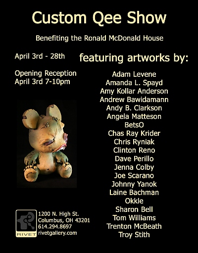 An opening reception will be held on April 3rd from 7:00 to 10:00. The figures will remain on exhibit from April 3rd – through the 28th. 25% of the sales proceeds from these Baby Qee figures will be donated to the Ronald McDonald House.