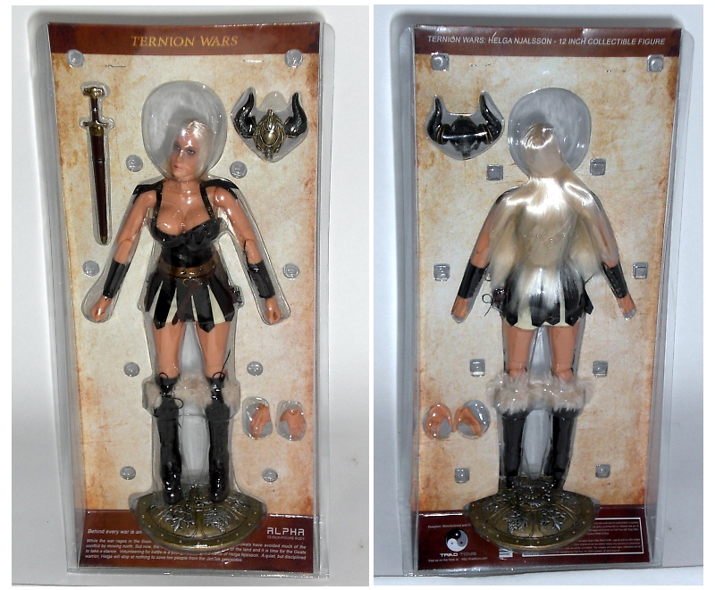 SCULPT/ACCESSORIES: Helga's body consists of the new Triad Alpha female 1:6 scale body. The head portrait features rooted Saran hair and looks highly realistic. The figure features several impressively crafted accessories such as the ornate shield and Viking helmet. All the weapons and accessories are intricately detailed and on par with the quality of other 1:6 figure companies such as Sideshow and Hot Toys.