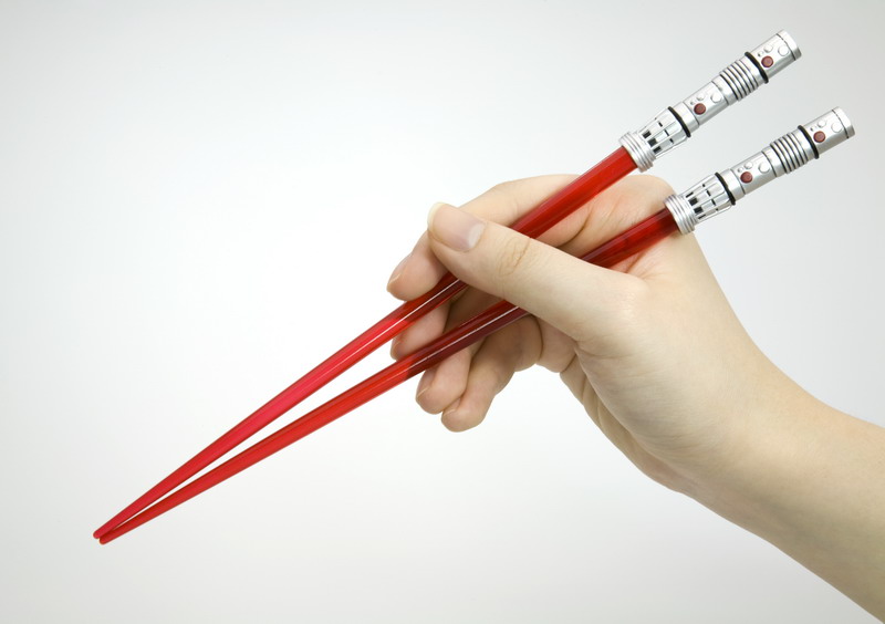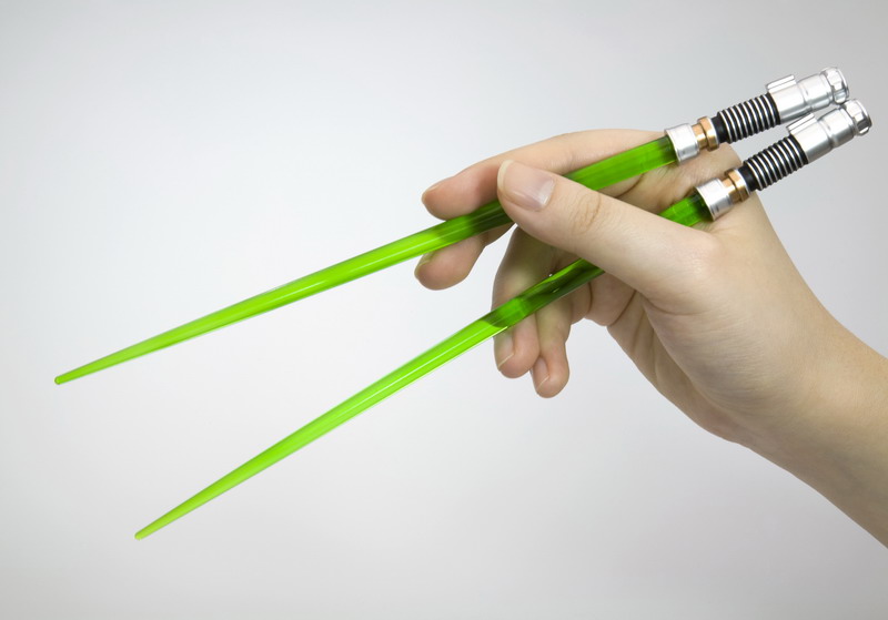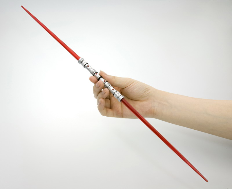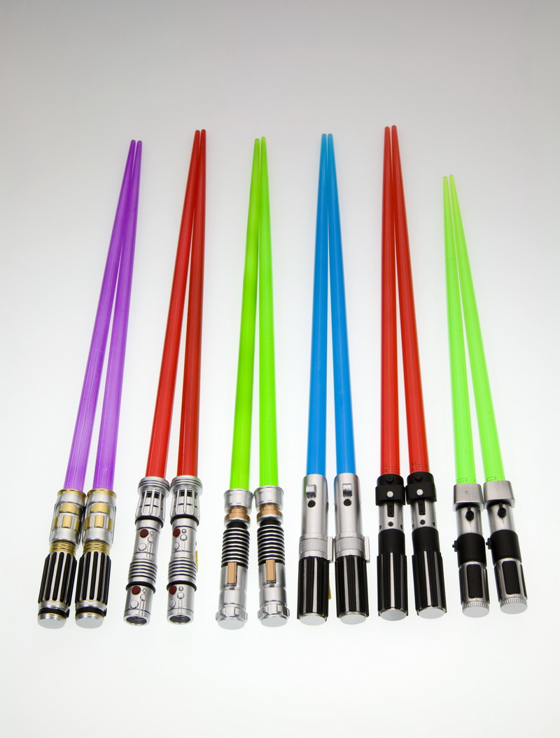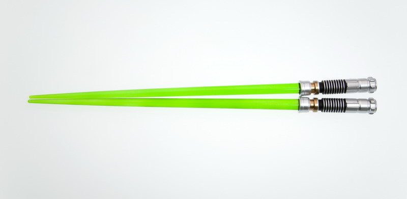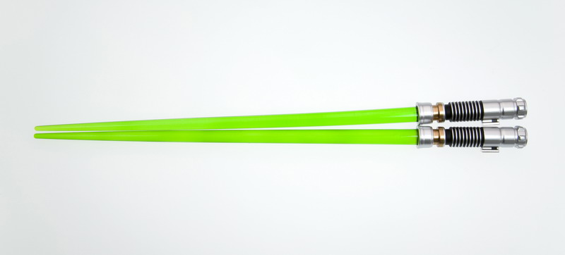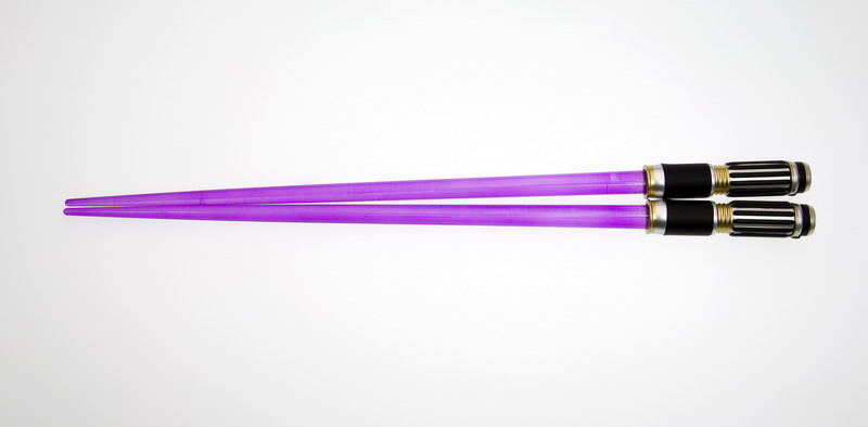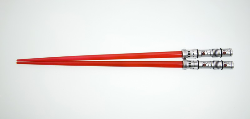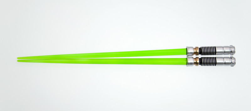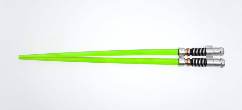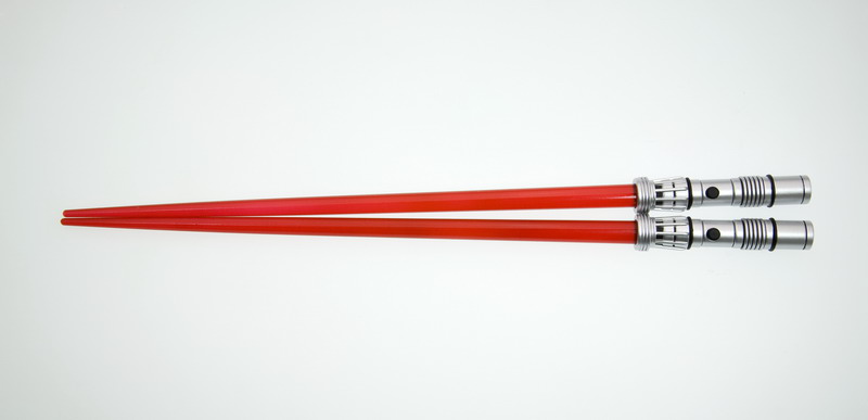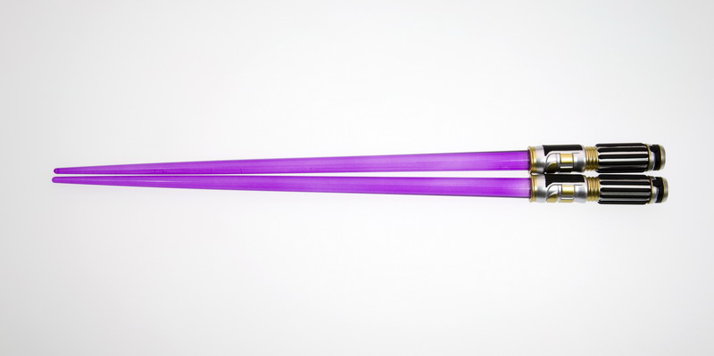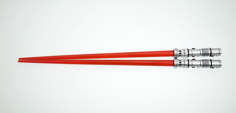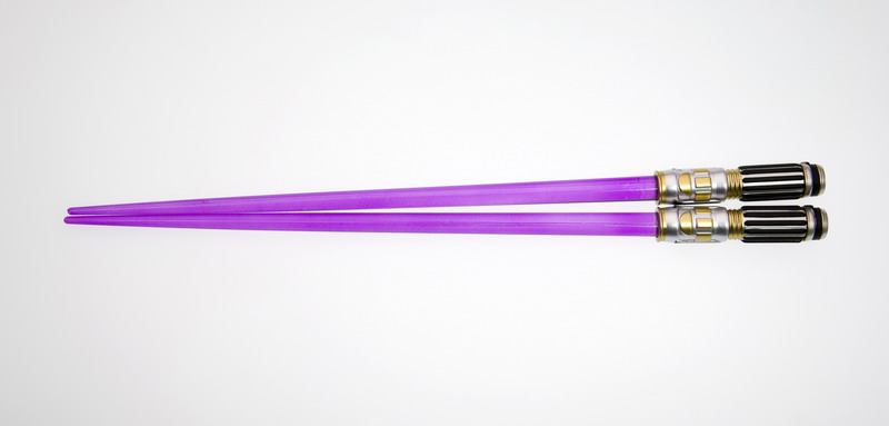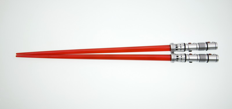 Suitable for eating sushi or defending the galaxy, the chopsticks' lightsaber blades are cast in translucent material. All new chopsticks sets (green Luke Skywalker lightsabers from Return of the Jedi, red Darth Maul lightsabers from A Phantom Menace, and all new purple Mace Windu lightsabers from Attack of the Clones and Revenge of the Sith) measure over 9" long, and a special bonus connector piece lets you turn the Darth Maul chopsticks into a fun double-bladed lightsaber. Like the first series of lightsaber chopsticks, each new set includes translucent Star Wars logo chopstick rests.