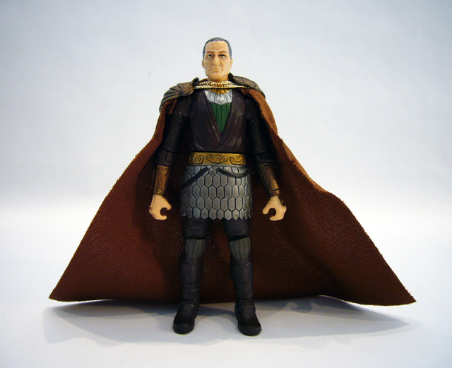 Exar Kun has great articulation with joints at the neck, ball-jointed shoulders, ball-jointed elbows, waist, hips, ball-jointed knees, and ball-jointed ankles. He has a handful of accessories including a long brown soft goods cloak complete with gold neck strap, shoulder pad piece that plugs into a hole in his back, and two fairly nondescript blue lightsabers that connect at the hilts to form the character's trademark double-bladed lightsaber.
