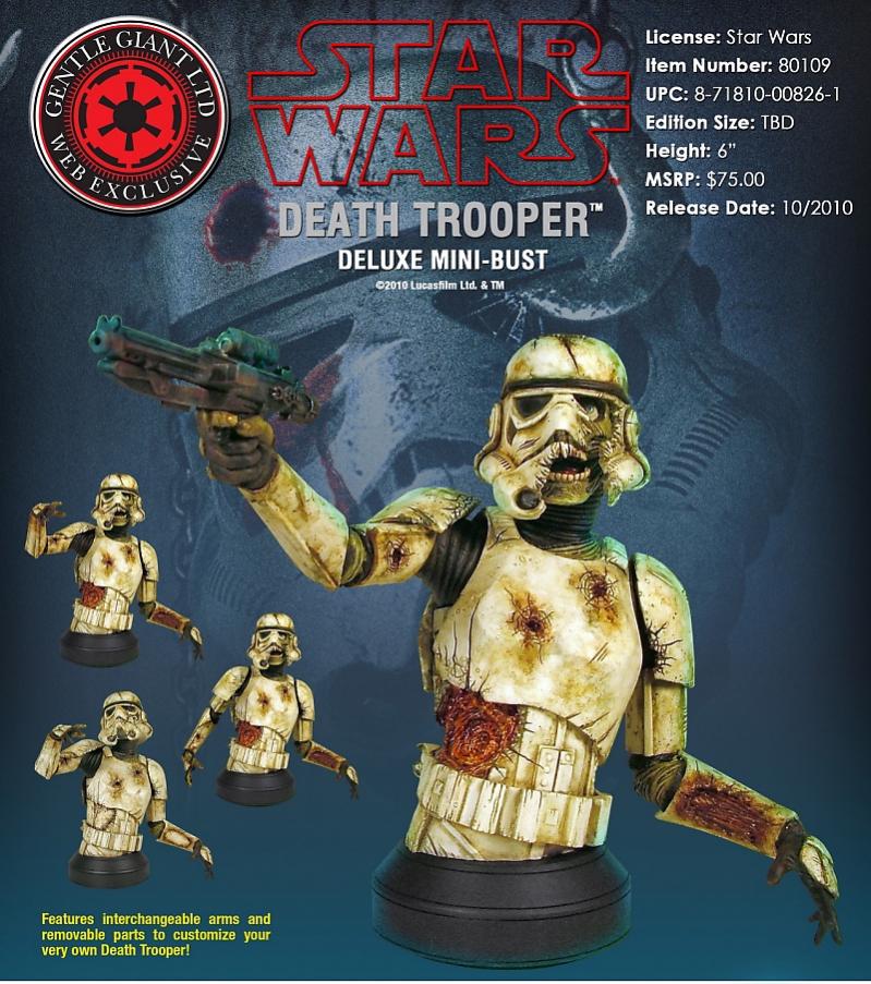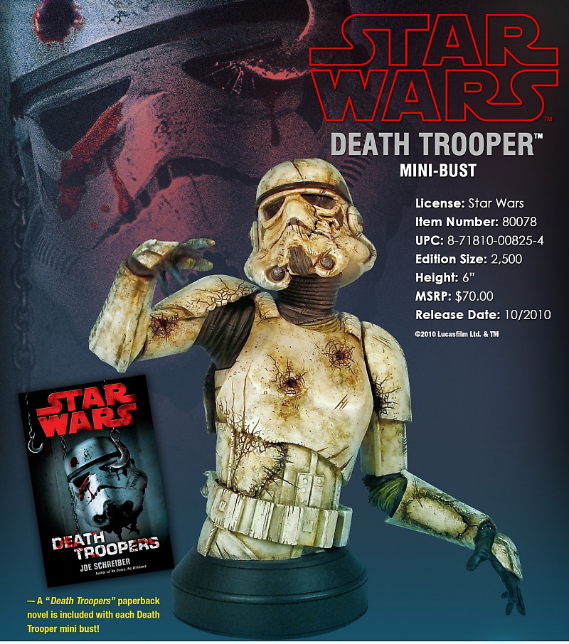 Every now and then a unique Star Wars item comes along that makes you pause and utter "whoa". Such is the case with Gentle Giant's unveiling of their latest 1:6th scale resin mini-bust, the Death Trooper. Combining the collectible power of the Force with the morbid popularity of all things undead, the Death Trooper is pulled from Joe Schreiber’s Star Wars horror novel of the same name: DEATH TROOPERS. The 6" tall mini-bust will release this November as two versions:
