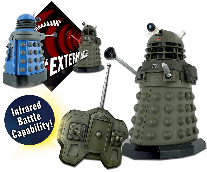 This fully functional radio controlled Dalek Ironside has full 360 degree movement control, a built-in infrared combat system which allows you to use two Daleks to battle against each other, flashing lights and speech. Features also include a poseable gun and arm. Frequency supplied is 27Mhz. Requires 6 x AAA batteries. The 5" Infrared Battle RC Ironside Dalek is slated for release this July.Professor Edwin Bracewell was an inventor working for the British Army during the second World War. He had a brilliant mind, and ideas such as "hypersonic flight" and "gravity bubbles" seemed to come to him from nowhere. One particular concept was the "Ironsides;" robots designed to be the perfect warrior, equipped with a ray gun and manipulator arm, and pressed into service as Britain's latest weapon. However, Ironsides were really the last remnants of the Daleks, who had fallen back through time. Professor Bracewell was in fact their android creation, part of a complex trap to lure the Doctor back to where they were hiding, so he would unwittingly allow the Dalek race to be reborn...