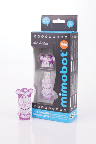 Having launched their Mimobot line in the summer of 2005 at San Diego Comic-Con, Mimoco's anniversary celebration centers on a string of product announcements taking place over the next six weeks starting with today's re-release of four original limited edition Core Series characters in new colorways. Isadore, the very first Mimobot character to be flashported to Earth, and last seen five years ago, returns in a new green color variant. He is joined by a blue Fairybit, a purple Swirl, and a fourth generation black RayD81. All are now available in 2GB to 16GB capacities at mimoco.com.