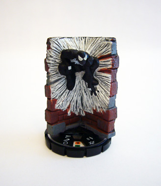 Venom utilizes the same sculpt as Spider-Man #022, capturing the web-slinger lying in wait amidst a bundle of webs. He’s suspended in a corner formed by two brick walls, peering out at his foes while his left hand forms the classic web-shooting pose. Venom is, of course, monochromatic in black and white, and the logos on his chest and back look great. His walls are brown and gray, with nice variations in the brick sizes and overall texture.