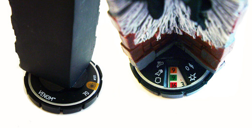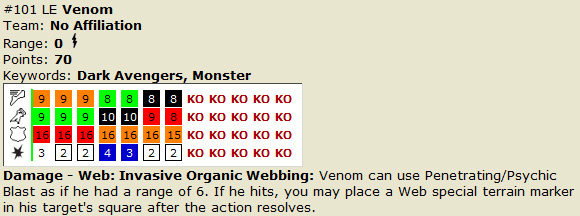 In game terms, Venom is a very different animal unlike the other Spider-Man themed figures. He’s unique and clocks in at a nice mid-ranged 70 points. With solid numbers and only one single number on his dial without a power Venom will be well worth the investment, especially on a theme Dark Avengers team. Starting off with Leap/Climb to get around, Super Strength for big damage, and Super Senses to avoid getting hurt, Gargan gets into the action quickly. Later he switches to a long string of Toughness, and alternates two power sets of Charge and Steal Energy and Stealth and Blades/Claws/Fangs, while his damage slot has two clicks of Shape Change and four of a Special Power granting him Penetrating/Psychic Blast that leaves webs behind (Invasive Organic Webbing)!