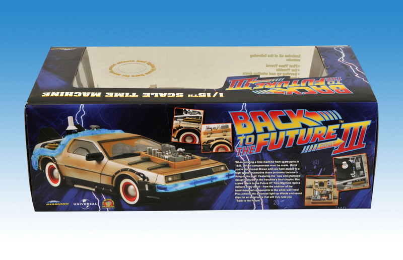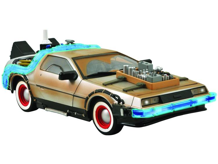 Speeding into stores any day now is Diamond Select Toys' latest take on the Back to the Future DeLorean Time Machine, this time depicting the cool ride as seen in the third and final film. Featuring new hood-mounted components and white-wall tires, Doc Brown's invention also stars time-traveling lights and sound effects.