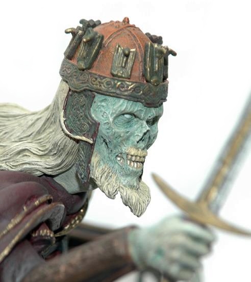 In The Clash of the Kings Statue, we find both Aragorn and the King of the Dead expertly sculpted, facing off with swords drawn. Each features rich detail and beautifully crafted, film accurate appearances. Aragorn features his ranger outfit, with cloak and clothing expertly sculpted to look as if he’s in mid-swing. Likewise, the King of the Dead’s garb – including his robes, crown, and even minutely sculpted buckles and armor pieces – look perfect.